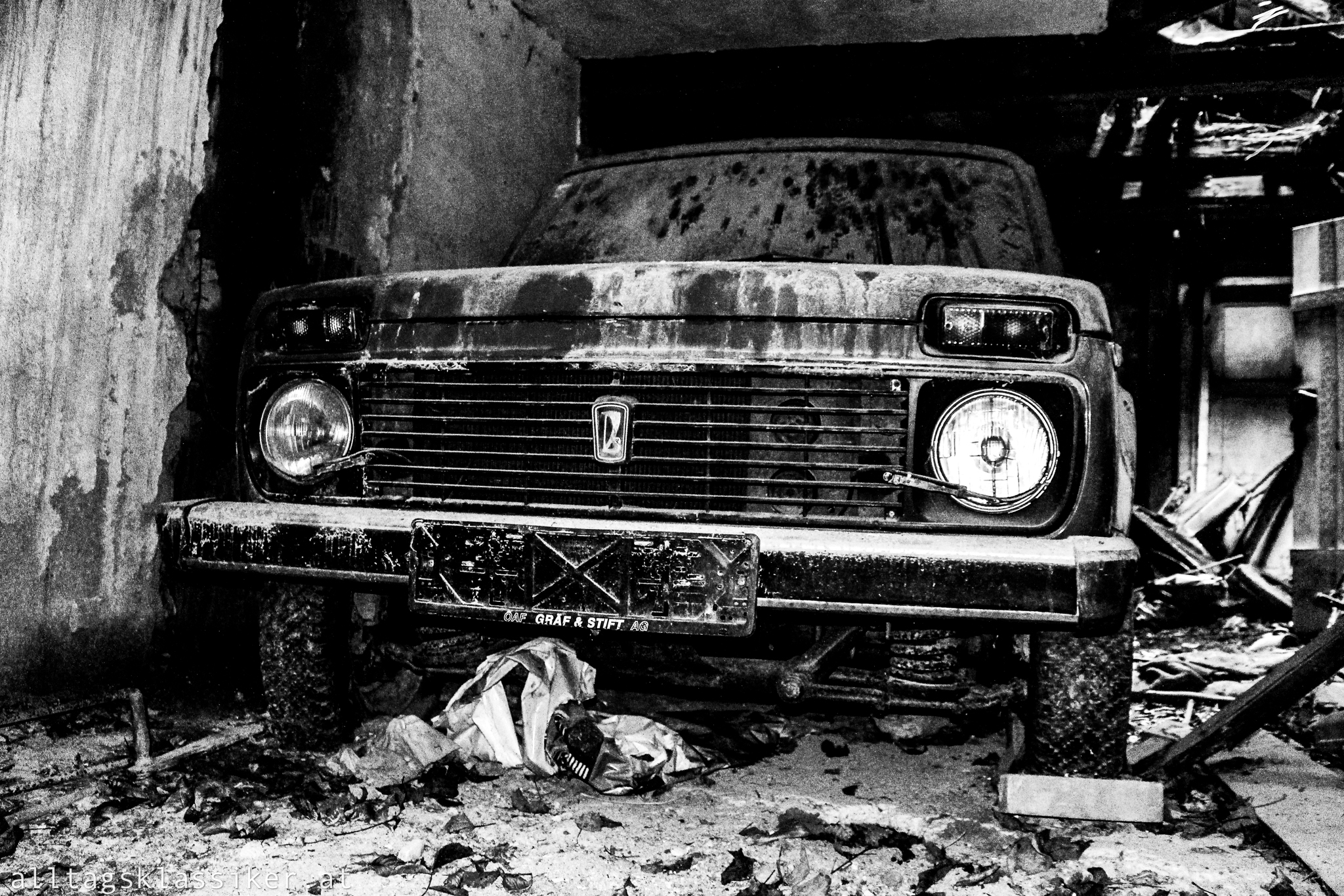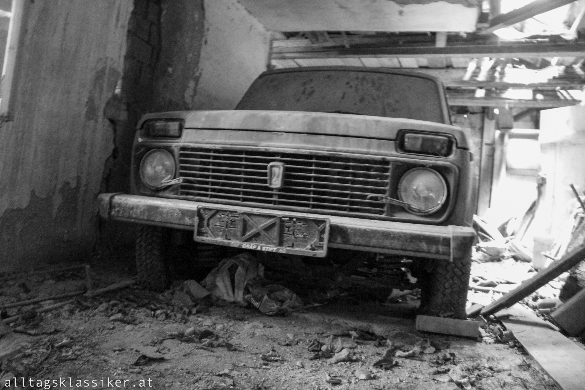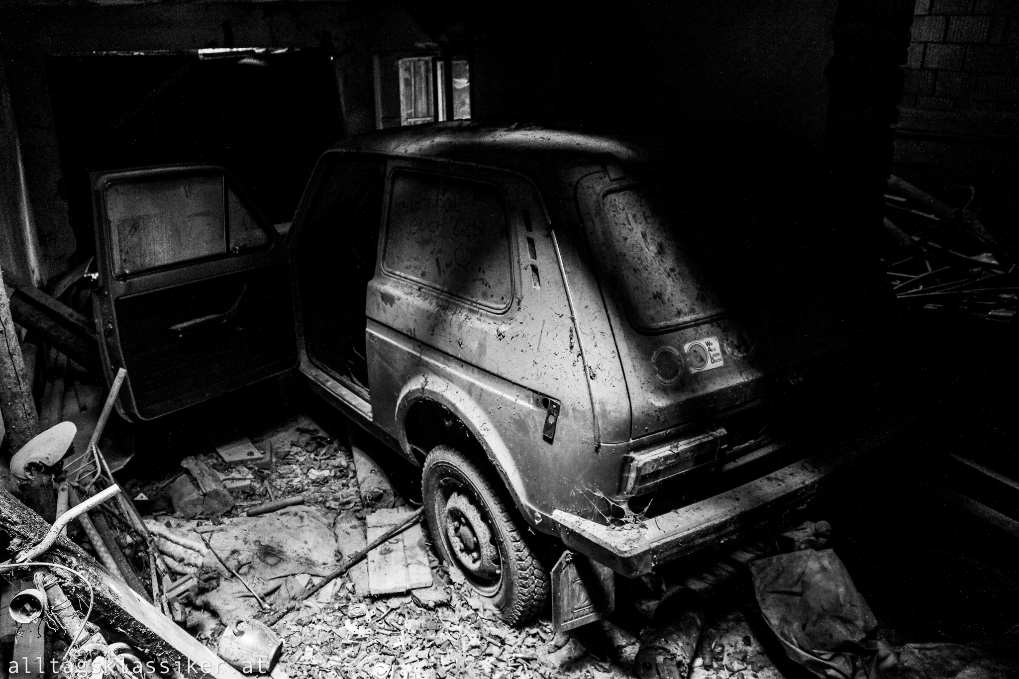 Öffnet man den halb geöffneten hölzernen Garagentorflügel, springt einen fast ein Lada Niva 1600 an. Der blassgrüne russische Geländewagen hat auch bereits bessere Zeiten gesehen. Unter einer dicken Staubschicht dämmert er vor sich hin. Auf den Fensterscheiben haben sich bereits frühere Schatzsucher verewigt, die Botschaften gehen von nett „Ich hab euch lieb“ bis zu spooky „Ich töte euch alle“. Der Innenraum ist über und über mit Schimmel überzogen, scheint aber relativ unversehrt zu sein.