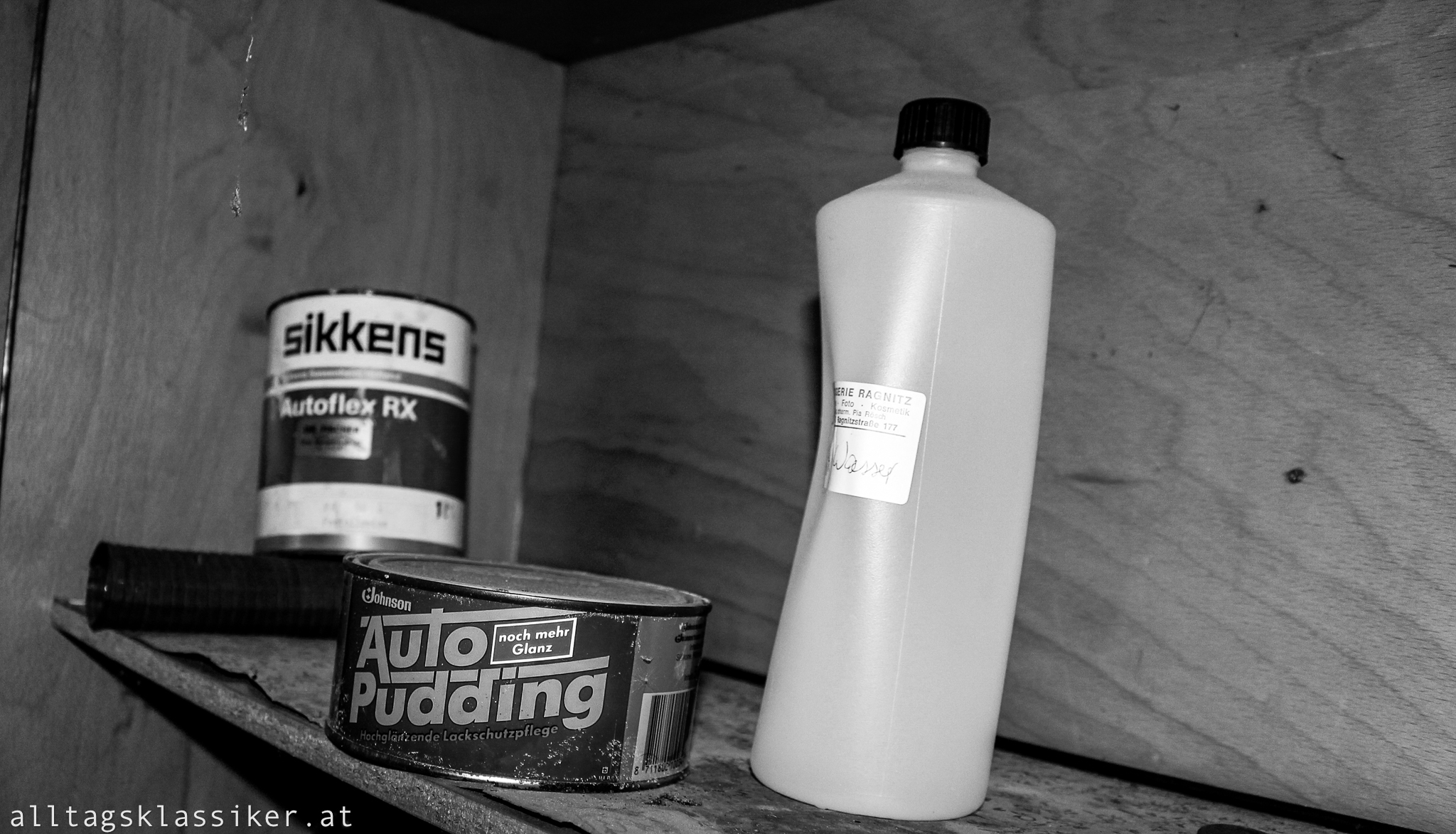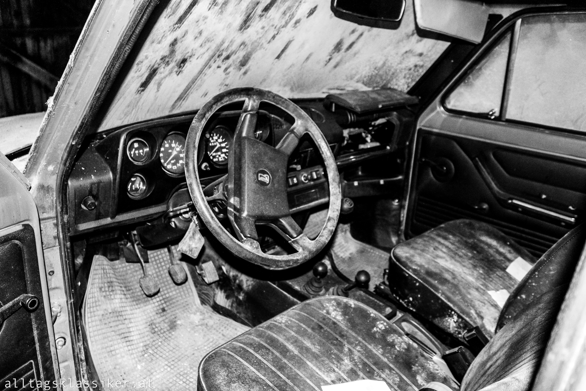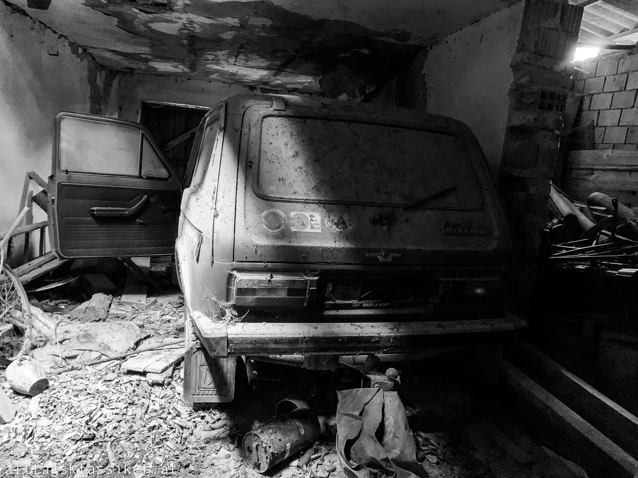 Öffnet man den halb geöffneten hölzernen Garagentorflügel, springt einen fast ein Lada Niva 1600 an. Der blassgrüne russische Geländewagen hat auch bereits bessere Zeiten gesehen. Unter einer dicken Staubschicht dämmert er vor sich hin. Auf den Fensterscheiben haben sich bereits frühere Schatzsucher verewigt, die Botschaften gehen von nett „Ich hab euch lieb“ bis zu spooky „Ich töte euch alle“. Der Innenraum ist über und über mit Schimmel überzogen, scheint aber relativ unversehrt zu sein.