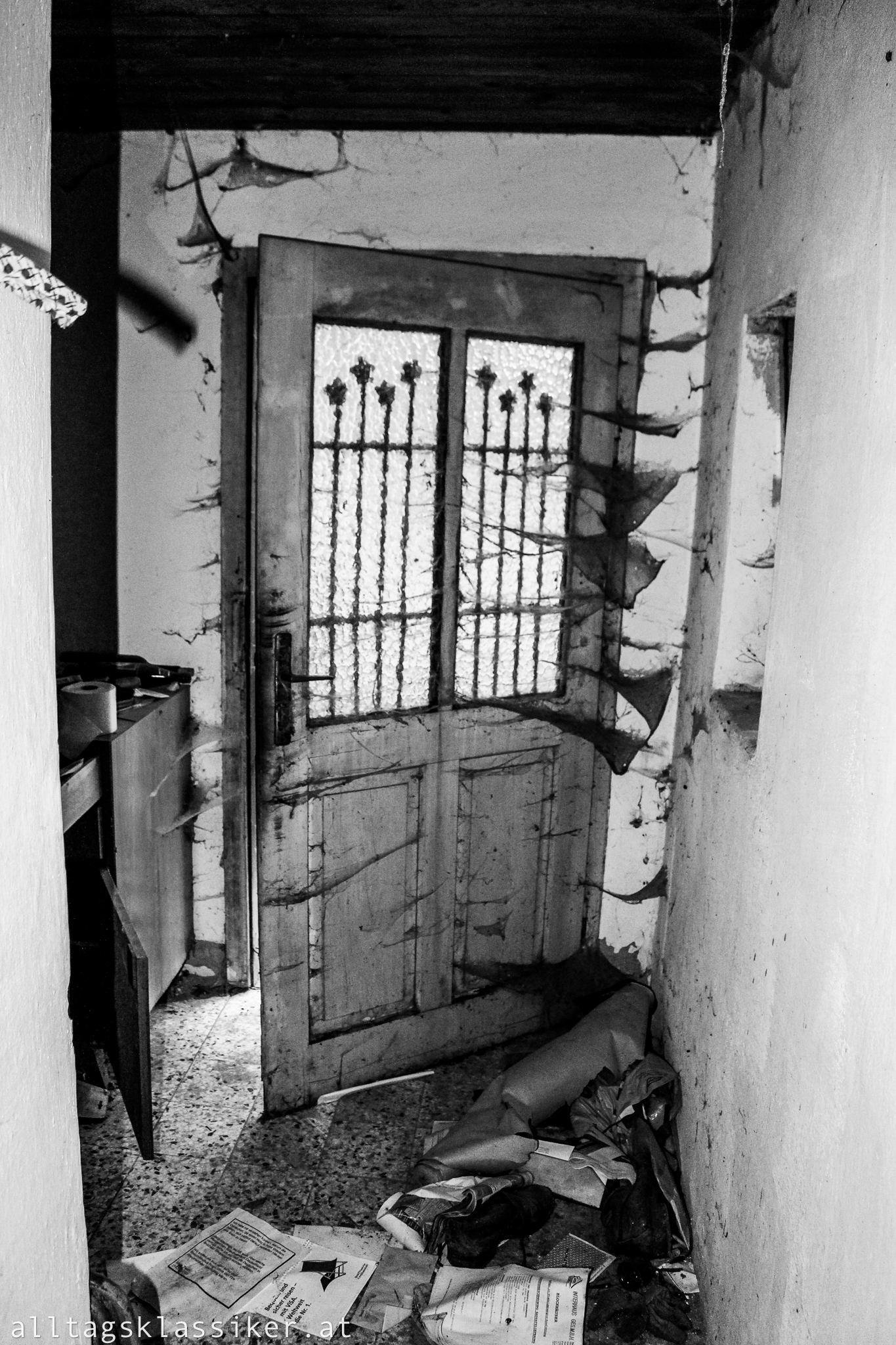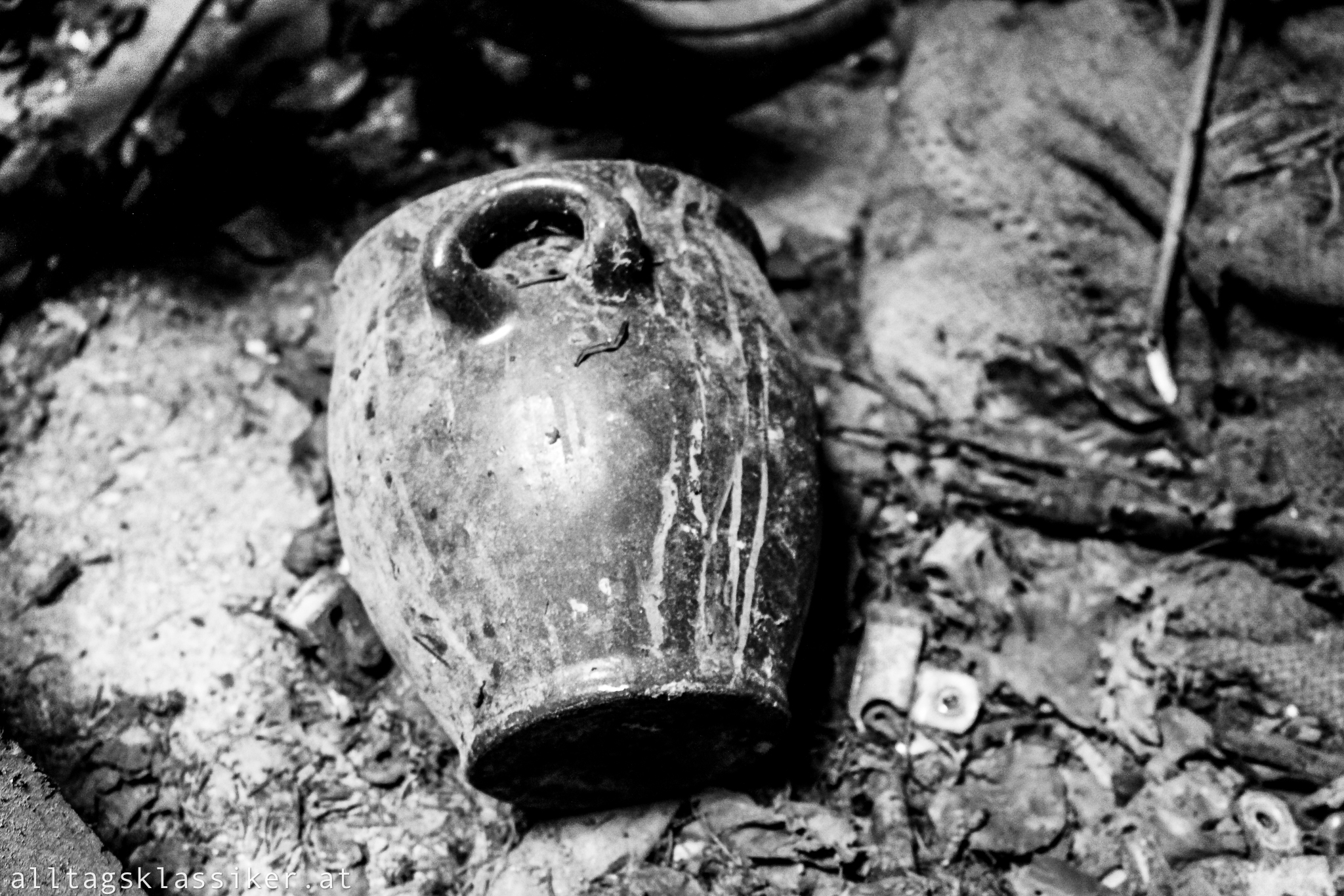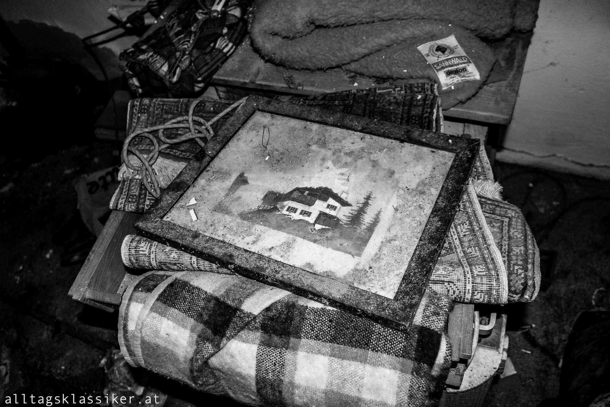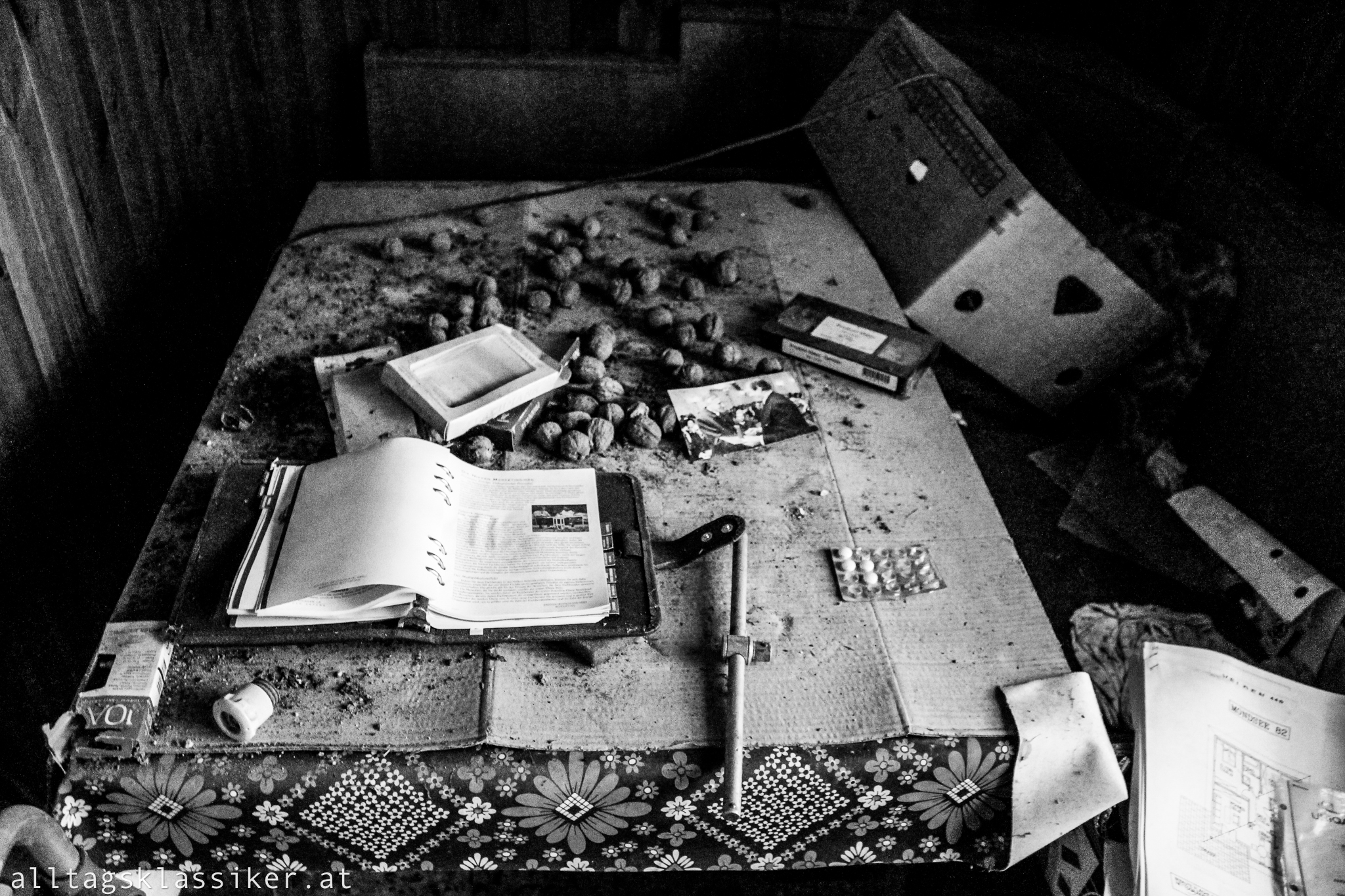 Nicht unweit davon lehnt ein Fahrrad, dick überzogen mit Spinnweben. Wandert man in das Erstgeschoss, findet man jede Menge Unordnung. Aufgerissene Schubladen, offenstehende Kastentüren, lose herumliegenden Hausrat. Dazu jede Menge Bücher, Zeitungsschnipsel, Spirituosenflaschen, uralte Bierkisten, Kochtöpfe, Spraydosen, eine mechanische Nähmaschine, ein Rasierapparat aus weststeirischer Produktion, , Werkzeugkisten, eine Rodel, Benzinkanister, Reifen, ausgelatschte Schuhe, Reiseführer, und Konservendosen vom Konsum. Dazu jede Menge persönliche Dokumente des ehemaligen Bewohners, aus denen man, zumindest teilweise, das Leben nachvollziehen kann.