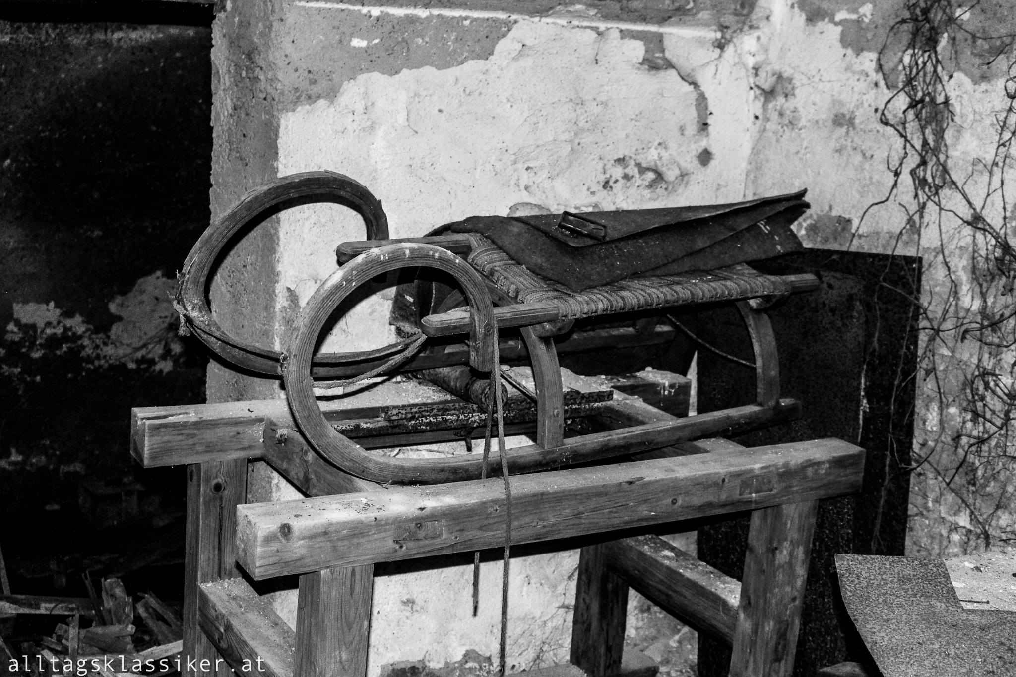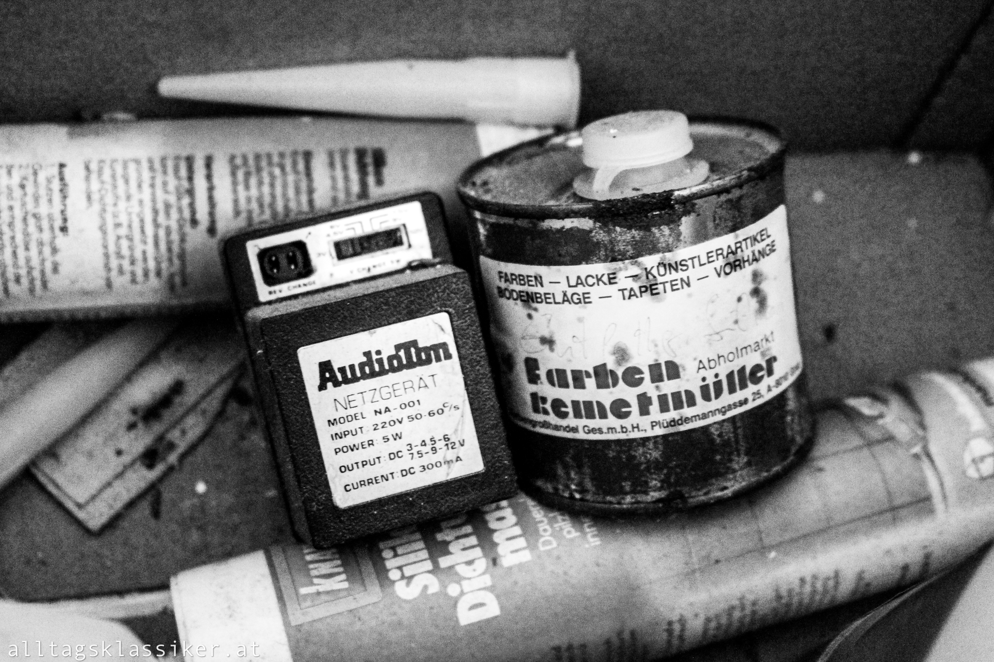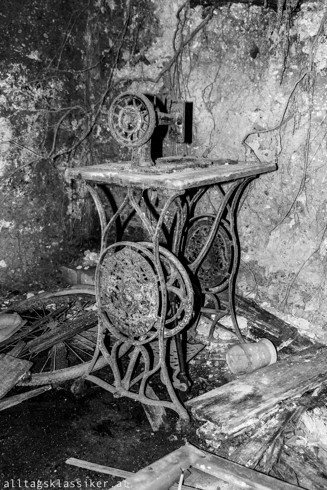 Nicht unweit davon lehnt ein Fahrrad, dick überzogen mit Spinnweben. Wandert man in das Erstgeschoss, findet man jede Menge Unordnung. Aufgerissene Schubladen, offenstehende Kastentüren, lose herumliegenden Hausrat. Dazu jede Menge Bücher, Zeitungsschnipsel, Spirituosenflaschen, uralte Bierkisten, Kochtöpfe, Spraydosen, eine mechanische Nähmaschine, ein Rasierapparat aus weststeirischer Produktion, , Werkzeugkisten, eine Rodel, Benzinkanister, Reifen, ausgelatschte Schuhe, Reiseführer, und Konservendosen vom Konsum. Dazu jede Menge persönliche Dokumente des ehemaligen Bewohners, aus denen man, zumindest teilweise, das Leben nachvollziehen kann.