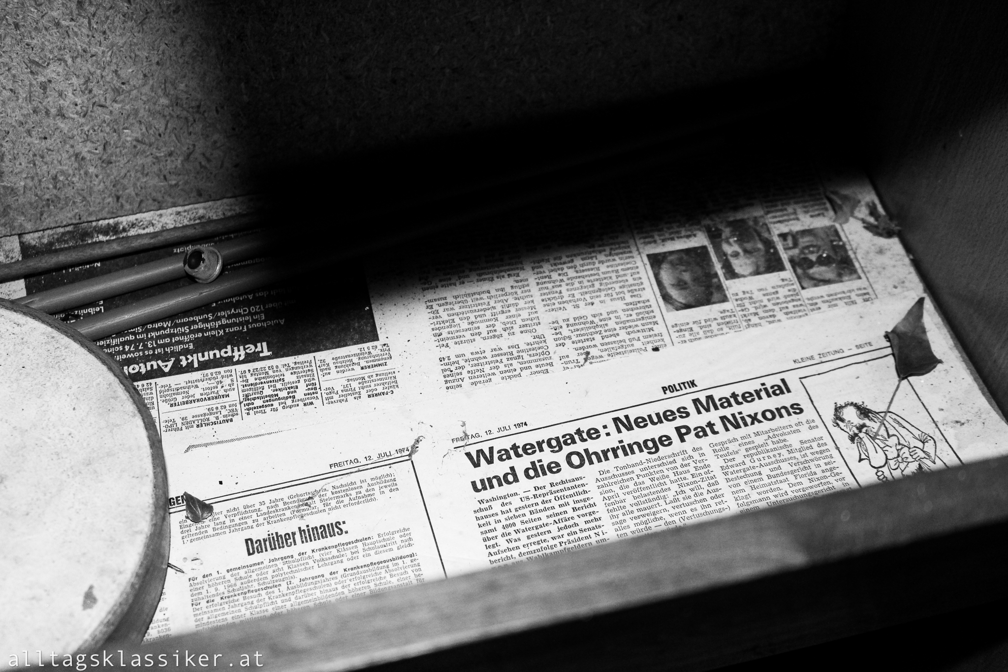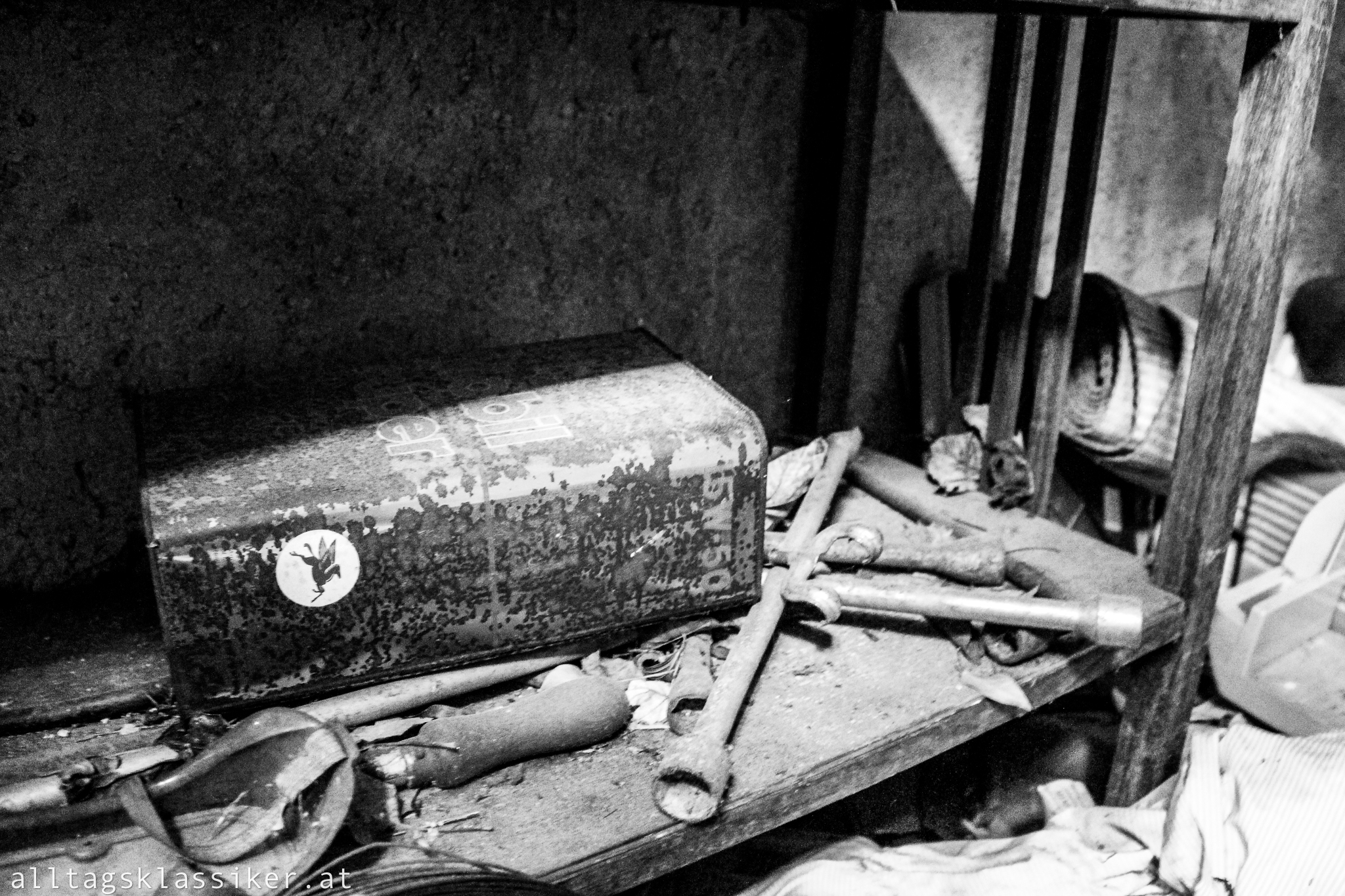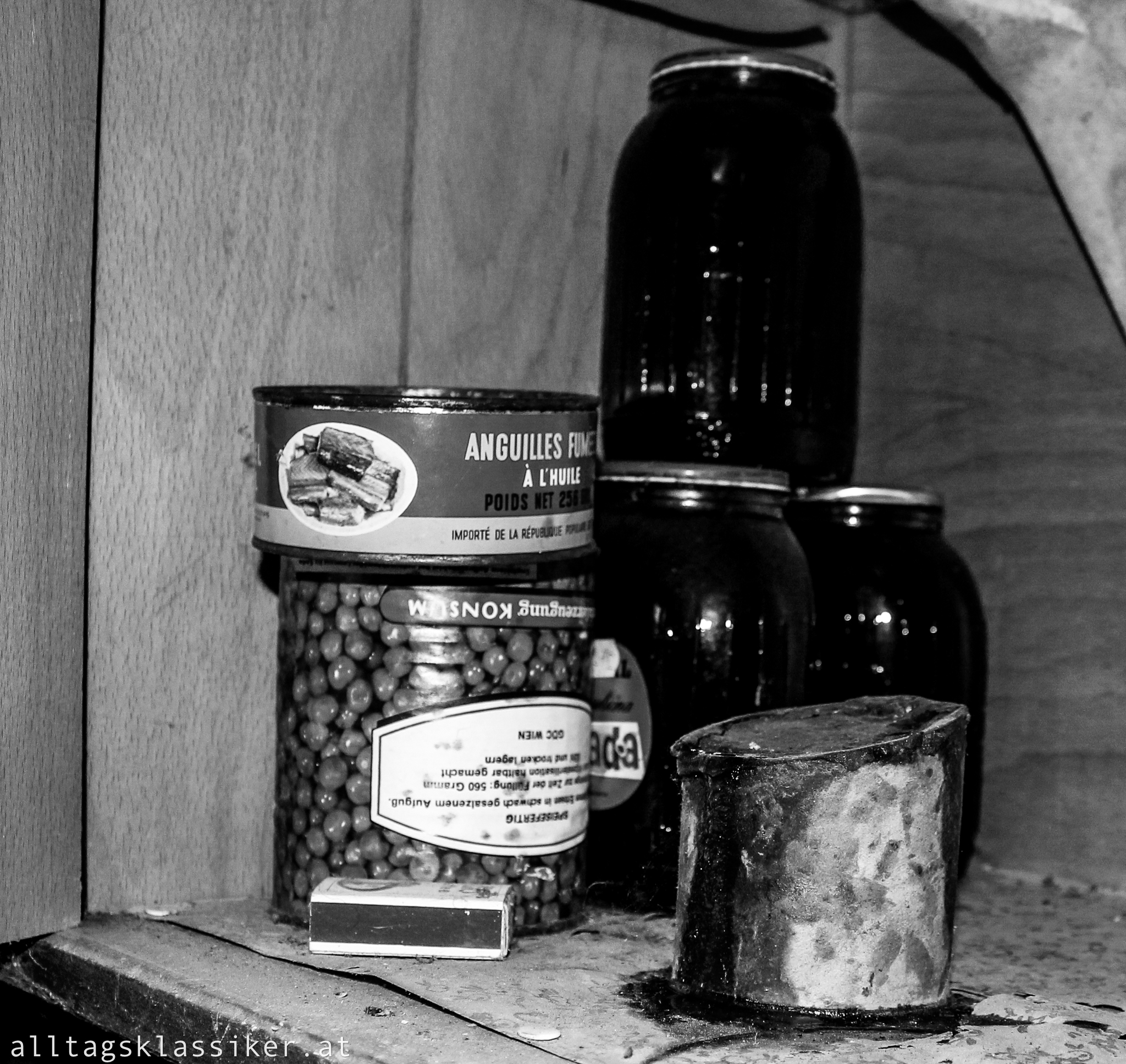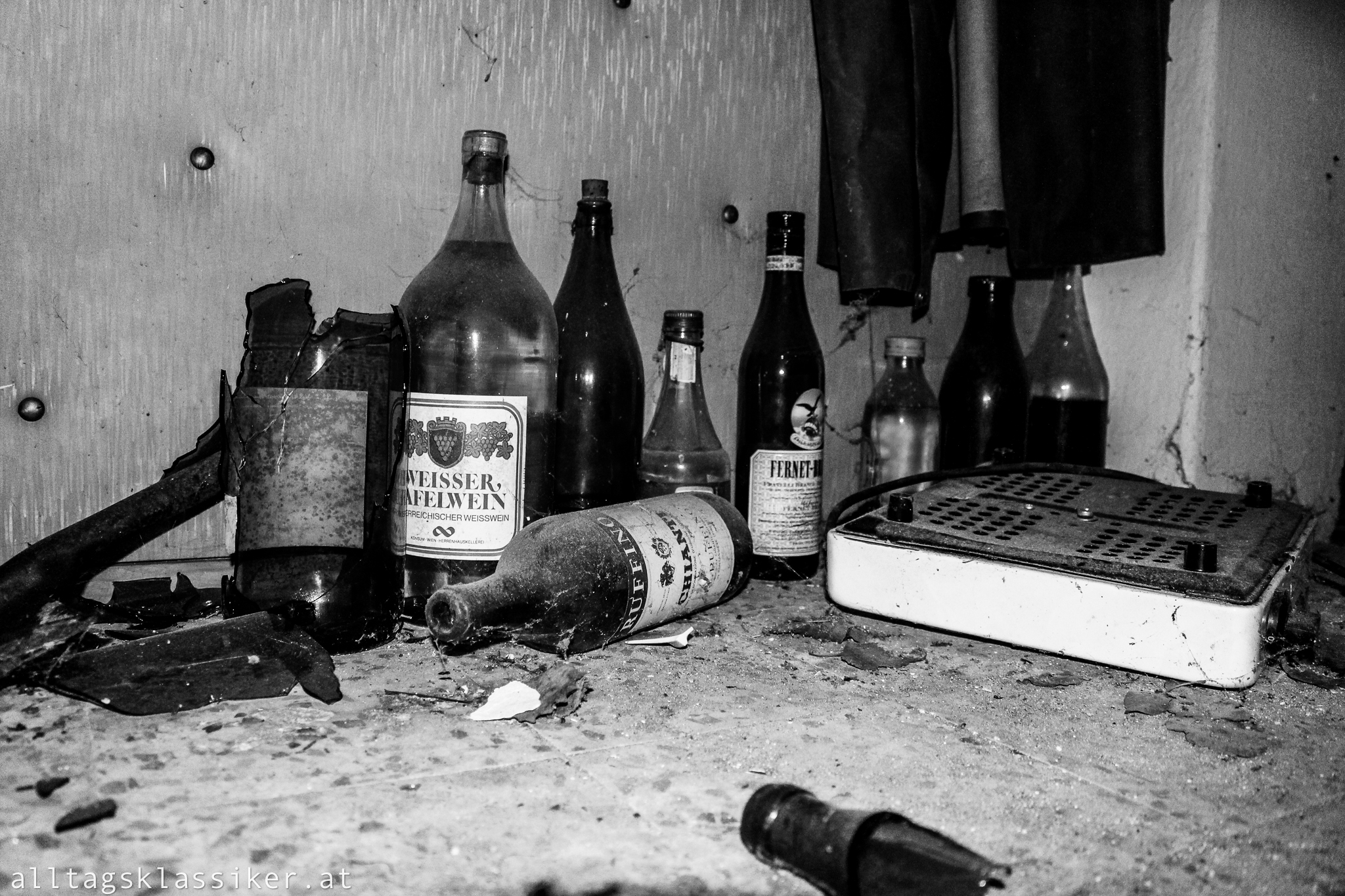 Nicht unweit davon lehnt ein Fahrrad, dick überzogen mit Spinnweben. Wandert man in das Erstgeschoss, findet man jede Menge Unordnung. Aufgerissene Schubladen, offenstehende Kastentüren, lose herumliegenden Hausrat. Dazu jede Menge Bücher, Zeitungsschnipsel, Spirituosenflaschen, uralte Bierkisten, Kochtöpfe, Spraydosen, eine mechanische Nähmaschine, ein Rasierapparat aus weststeirischer Produktion, , Werkzeugkisten, eine Rodel, Benzinkanister, Reifen, ausgelatschte Schuhe, Reiseführer, und Konservendosen vom Konsum. Dazu jede Menge persönliche Dokumente des ehemaligen Bewohners, aus denen man, zumindest teilweise, das Leben nachvollziehen kann.