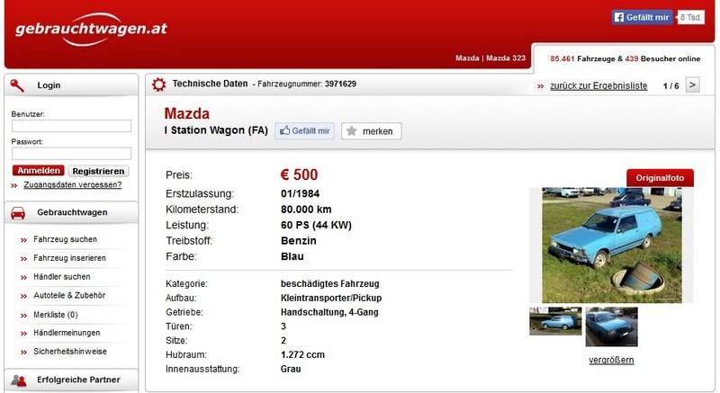 der mazda 323 van, der mich schon einige jahre immer wieder mal verfolgt, ist zu kaufen. erstmals gesehen ende 2010, zuletzt havariert im november 2013. man scheitert wohl an der ersatzteilbesorgung für den an sich schon raren 323 der ersten generation, das es auch noch ein van mit der ultrararen faceliftfront ist macht die suche auch nicht einfacher. zu finden ist der 323 van auf gebrauchtwagen.at.