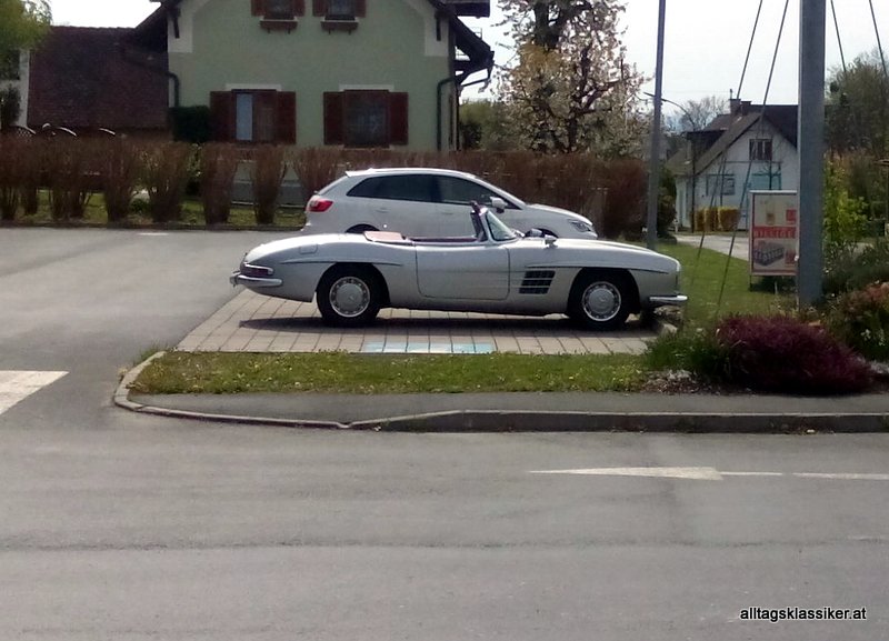 Die Chance eines der 1858 produzierten Exemplare des 300 SL Roadster, der offenen Variante des legendären Flügeltürers auf der Strasse anzutreffen ist eigentlich recht gering. Aber es gibt scheinbar Liebhaber, die damit auch zum Supermarkt fahren und dem 300SL als schnöden Einkaufswagen benützen. Den 300SL würde ich nicht als Alltagsklassiker bezeichnen, aber immerhin beweist er hier seine Alltagstauglichkeit.