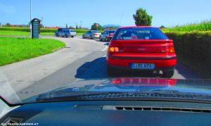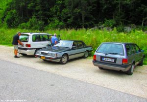 Am nächsten Morgen hatte ich dann Heimvorteil, als langsam die Teilnehmer zur Ausfahrt, die direkt vor meinem Quartier startete, eintrafen. Ich begab mich noch schnell zur Tankstelle im Ort, da ich bei der langen Strecke auf Nummer sicher gehen wollte. Mein Mazda 323 Kombi von 1993 (der Kombi wurde bei uns von 1986 bis 1995 verkauft) ist leider kein Kostverächter (8-9 Liter/100 km), aber die 86PS bei etwas über 900 kg Leergewicht machen dafür auch Spaß.