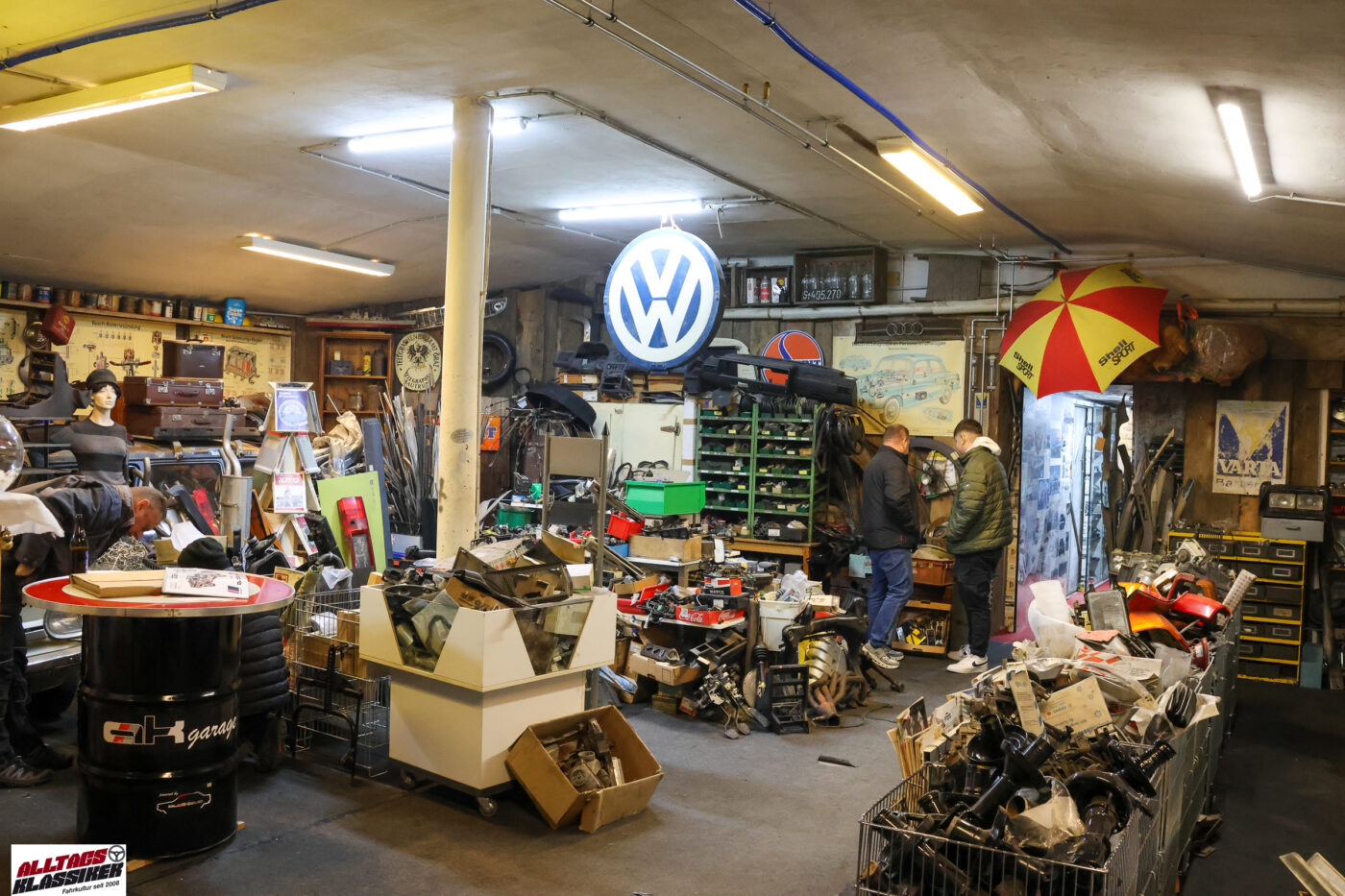 Man kann eben nicht alles haben. Dafür konnten wir einen dampfend heißen Kaffee genießen, der uns früh morgens die Augen öffnete und uns wieder einmal staunen ließ. Staunen über die Vielfalt an Fahrzeugen, zeitgenössischem Zubehör, Dekomaterial und Krimskrams rund um die Marken Volkswagen und Audi. Man glaubt, alles in der Casa Klaus schon einmal gesehen zu haben, und doch ist es wie ein Wimmelbild: Immer wieder entdeckt man neue, obskure und faszinierende Dinge, die man so noch nie oder seit 30 Jahren nicht mehr gesehen hat.
