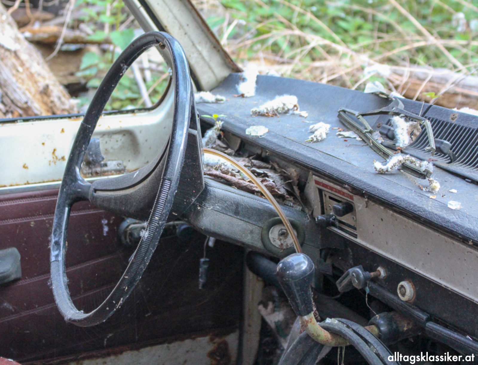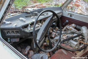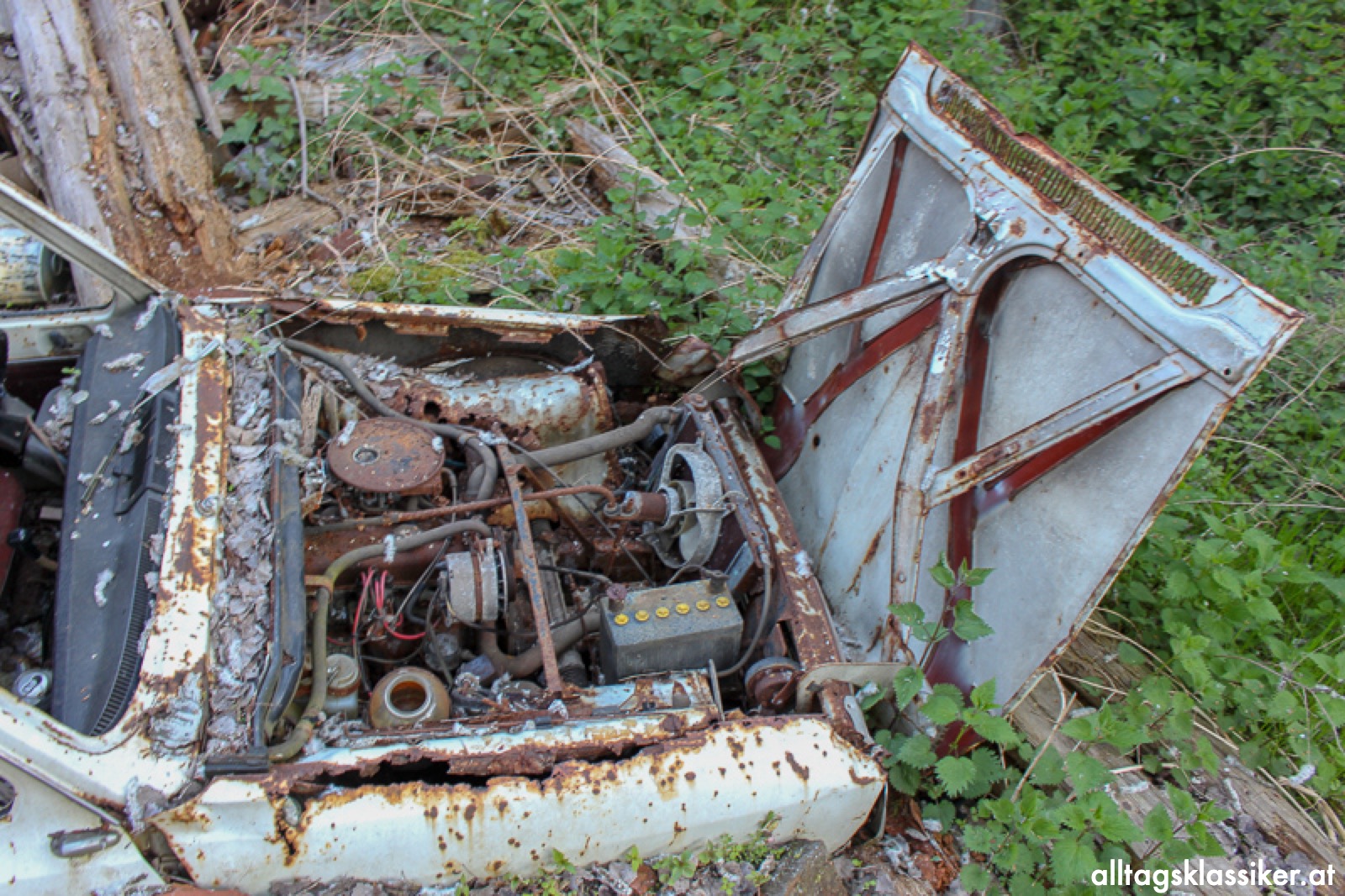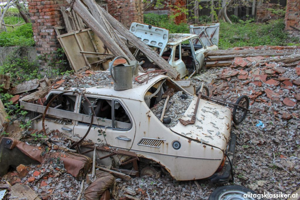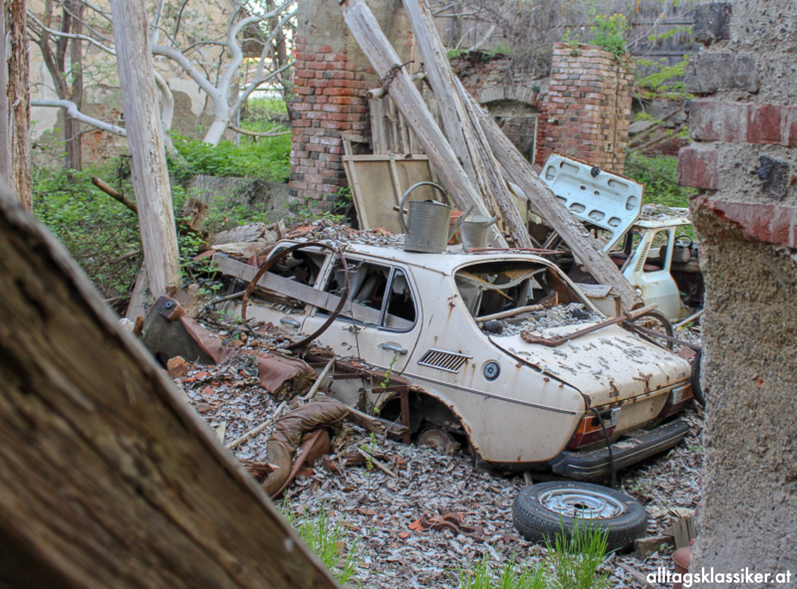 Dahinter in ähnlich verrottetem Zustand findet sich ein Saab 99, bei dem nur mehr eines der Rücklichter in einem Stück überlebt hat. Sämtliche Glasflächen sind wie beim R6 zu Bruch gegangen. Der Innenraum ist bis oben hin zugemüllt, ebenfalls sind hier leere Bierdosen stumme Zeugen einer partywütigen Meute. Auch hier Rost, Elend und Verfall wohin man blickt. Ein Aufkleber am Heck des zerfledderten Schweden, erzählt vom Händler, der den 99er glänzend an glückliche Käufer ausgeliefert hatte. Einst verkaufte man dort neben Saab auch Toyota, servicierte diese Marken und sorgte für den Ersatzteilnachschub im Grazer Norden. Das Ende von Saab 2011 und der Verlust des Händlervertrages mit Toyota und Lexus ließ auch den Händler taumeln, die erste Insolvenz erfolgte 2014. Ein Neustart Ende 2014 als Mazdahändler mißlang, 2015 wurde neuerdings Insolvenz beantragt, was 2018 zur endgültigen Schließung des Traditionsbetriebes führte.