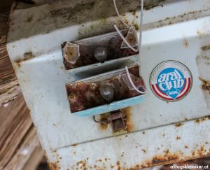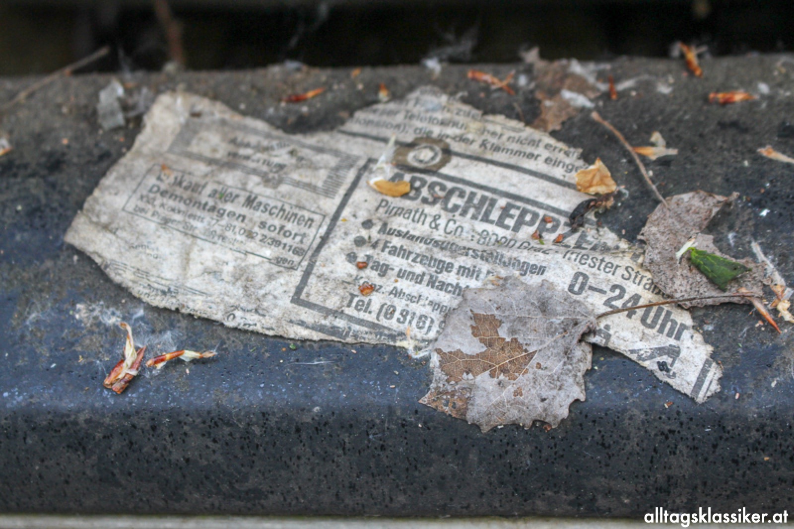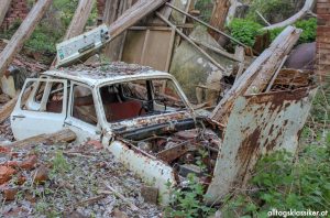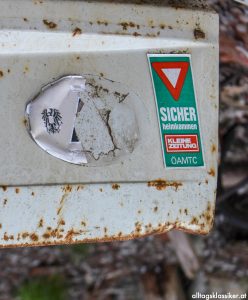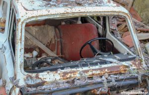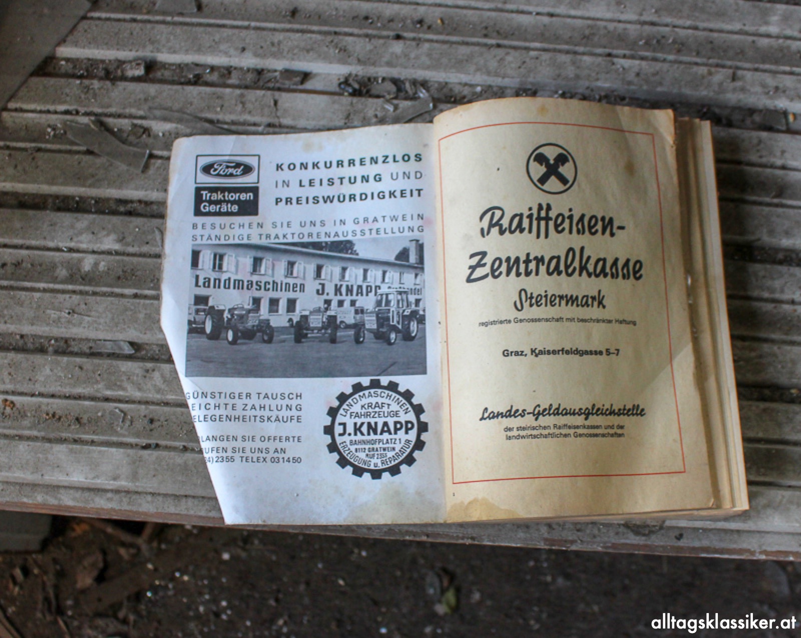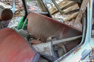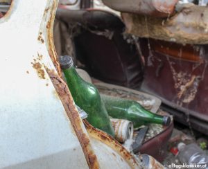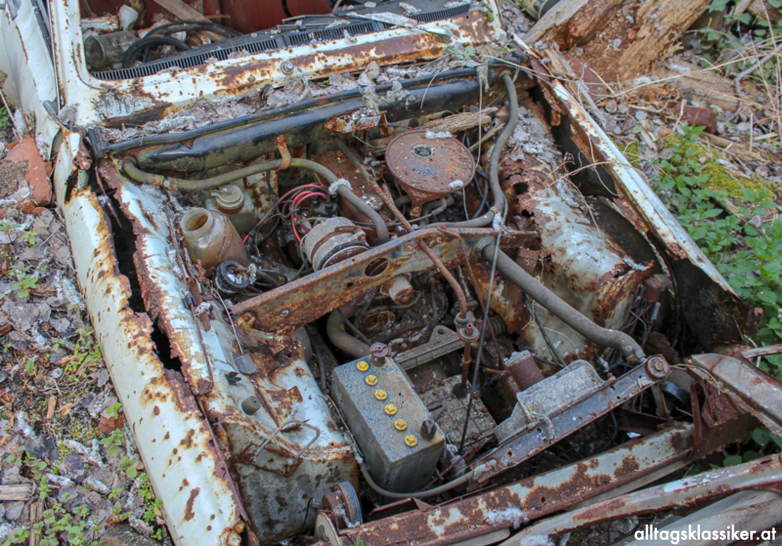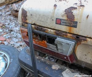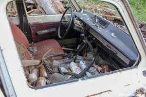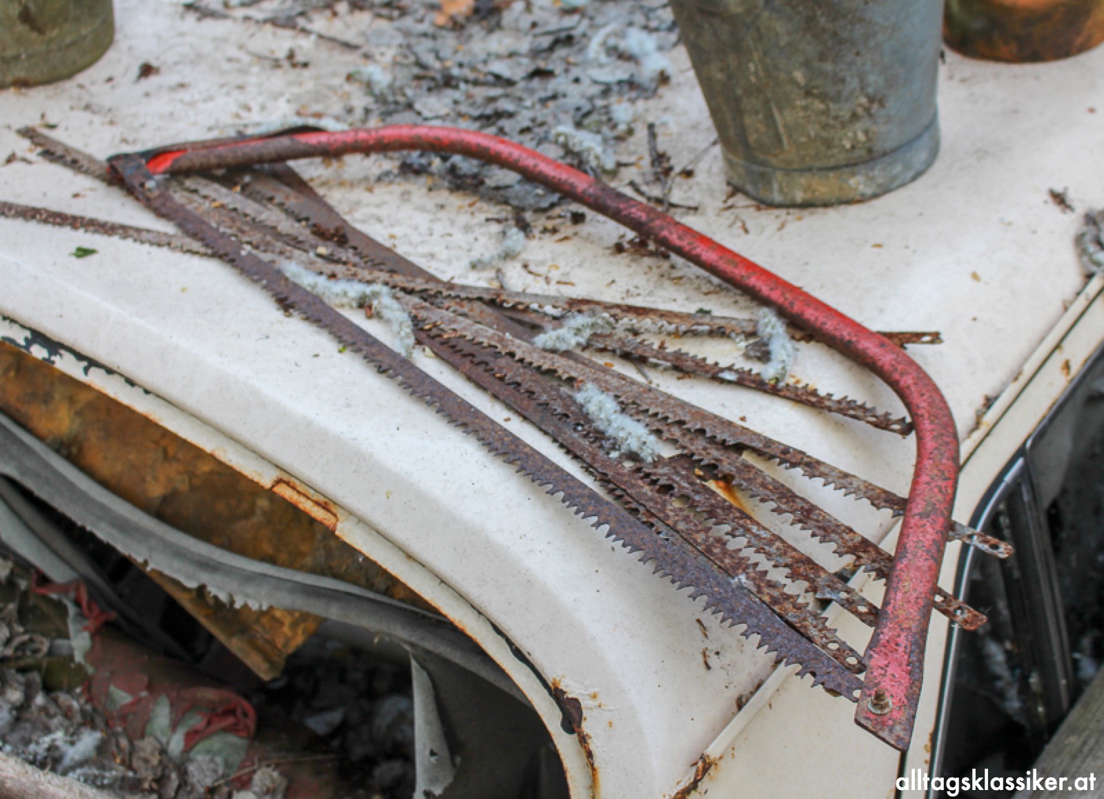 Dahinter in ähnlich verrottetem Zustand findet sich ein Saab 99, bei dem nur mehr eines der Rücklichter in einem Stück überlebt hat. Sämtliche Glasflächen sind wie beim R6 zu Bruch gegangen. Der Innenraum ist bis oben hin zugemüllt, ebenfalls sind hier leere Bierdosen stumme Zeugen einer partywütigen Meute. Auch hier Rost, Elend und Verfall wohin man blickt. Ein Aufkleber am Heck des zerfledderten Schweden, erzählt vom Händler, der den 99er glänzend an glückliche Käufer ausgeliefert hatte. Einst verkaufte man dort neben Saab auch Toyota, servicierte diese Marken und sorgte für den Ersatzteilnachschub im Grazer Norden. Das Ende von Saab 2011 und der Verlust des Händlervertrages mit Toyota und Lexus ließ auch den Händler taumeln, die erste Insolvenz erfolgte 2014. Ein Neustart Ende 2014 als Mazdahändler mißlang, 2015 wurde neuerdings Insolvenz beantragt, was 2018 zur endgültigen Schließung des Traditionsbetriebes führte.
