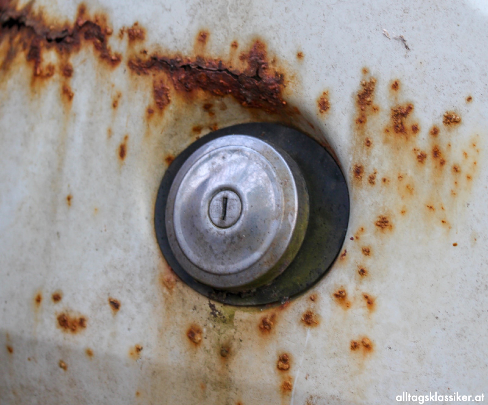 Kommen wir zudem Part wegen dem ihr hier schon einige Minuten meinen Ausführungen folgt, den Fahrzeugen: Im halb zusammengefallenen Wirtschaftsgebäude, wo früher wohl mal der Traktor, Anhänger, Egge und Pflug bei Nichtbenutzung untergestellt waren, stehen die vom Einsturz des Daches in Mitleidenschaft gezogenen Autos. Ein Renault 6, einst als großer Bruder des R4 konzipiert, ist versunken in Schutt und Müll. Was am verbeulten und stark verrosteten, frühen R6 mit Rundscheinwerfern noch nutzbar war, wurde wohl schon vor Jahren von Leichenfledderern ausgebaut und davon getragen. Den kläglichen Rest dieses Einsturzopfers haben Regen, Vandalen und die Feiernden erledigt. Schimmel überall, leere Bierdosen en Masse, der alte Franzose ist mehr als reif für die Presse. Einzig das Lenkrad und der Tankdeckel heben sich vom grindigen Zustand ab.