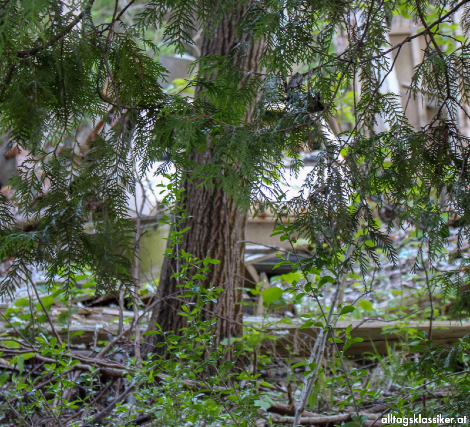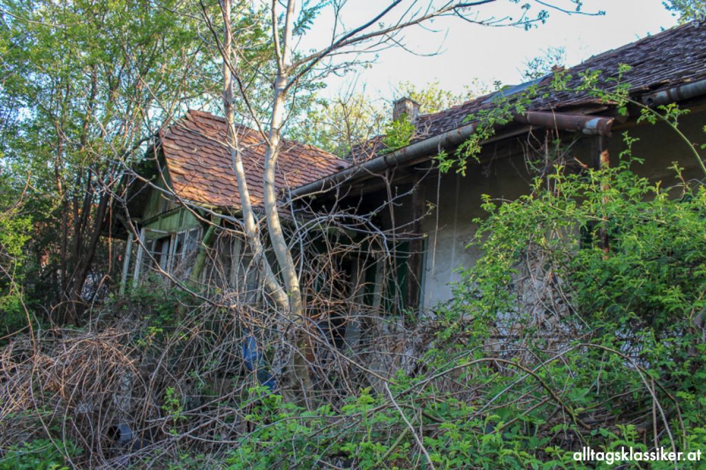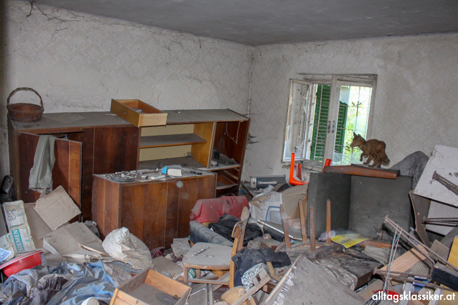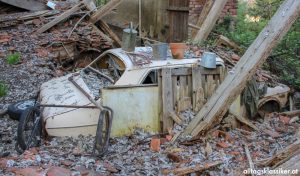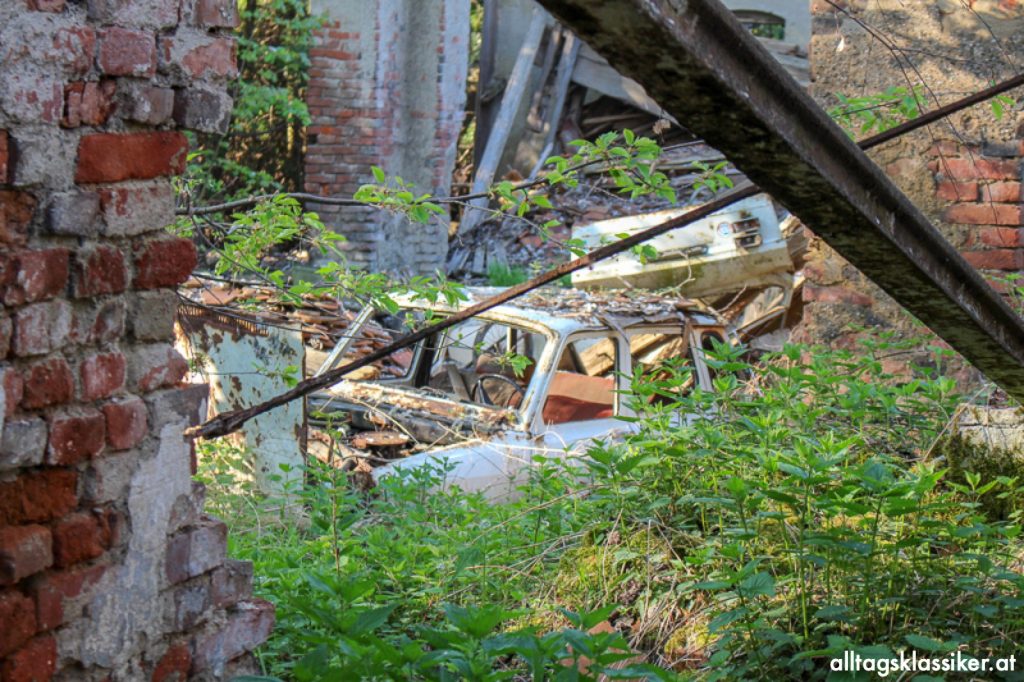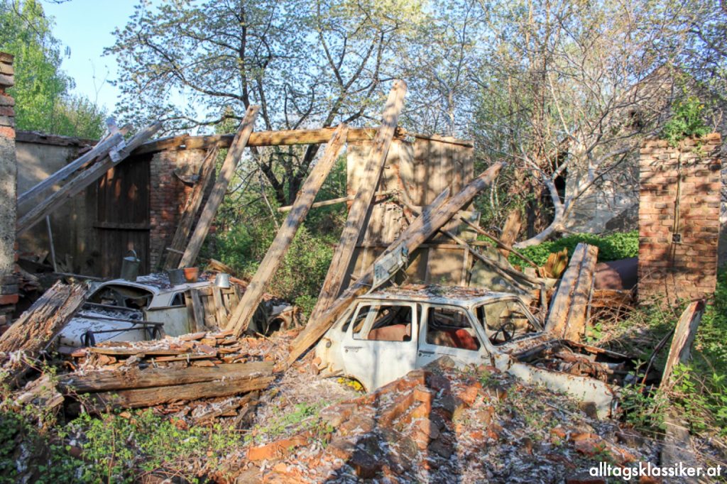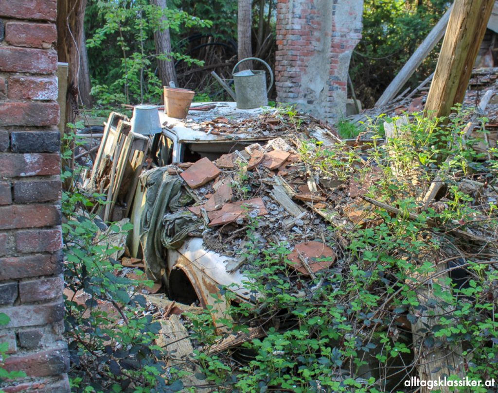 Das erste was man sieht, macht traurig: Ein halb eingestürztes Wirtschaftsgebäude von dem nur mehr die Grundmauern stehen, mittendrinnen zwei in Mitleidenschaft gezogene Fahrzeuge. Drumherum jede Menge Schutt, abgestürzte Dachziegel, das Gebälk des ehemaligen Dachstuhles und leere Bierdosen. Die Autos laufen mir nicht weg, dazu fehlen ihnen die Reifen und so manch anderes was sie am wegfahren hindert.