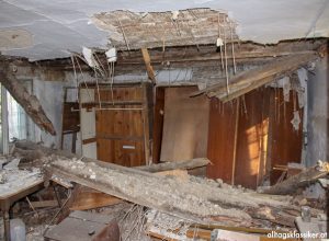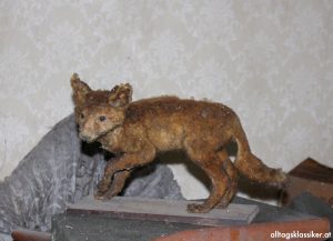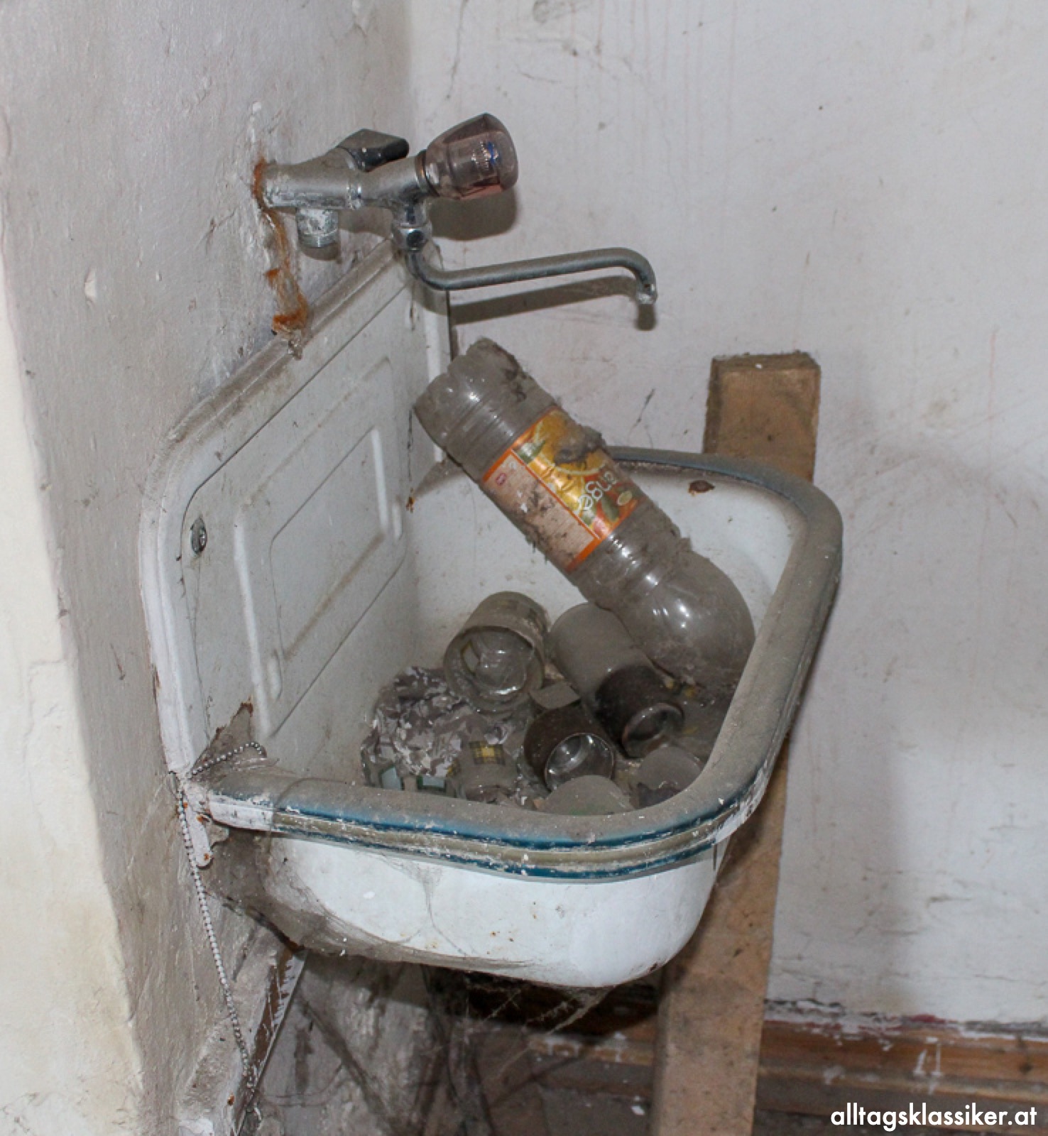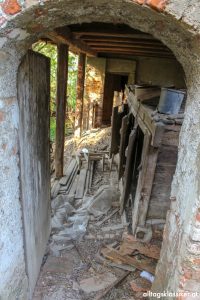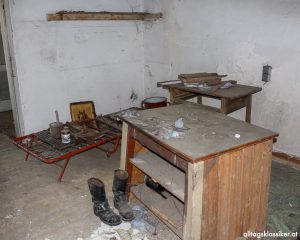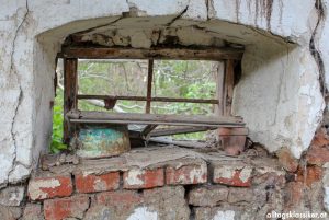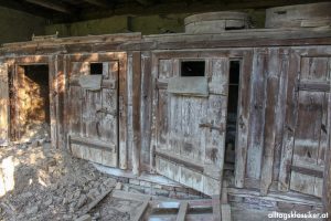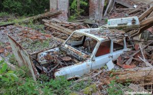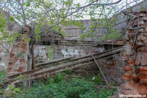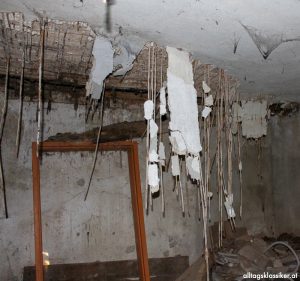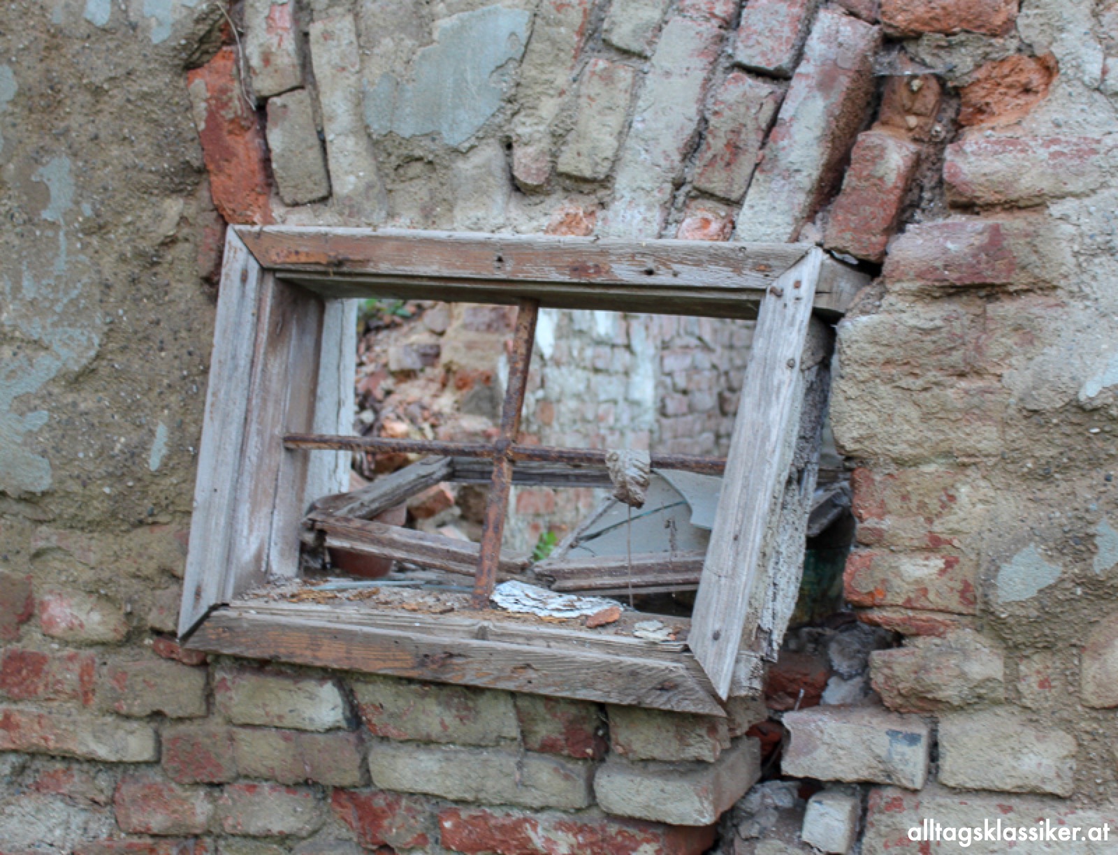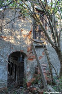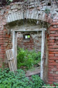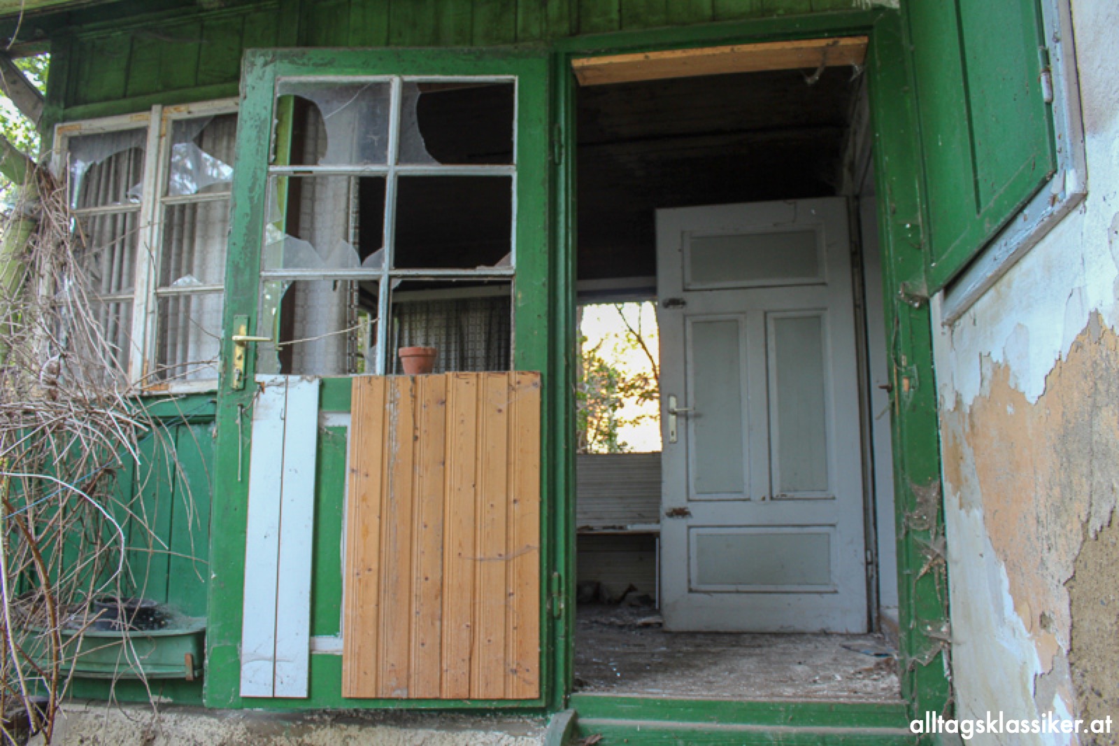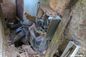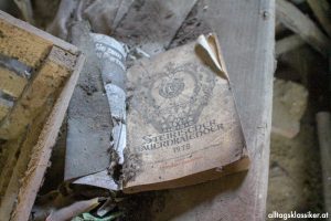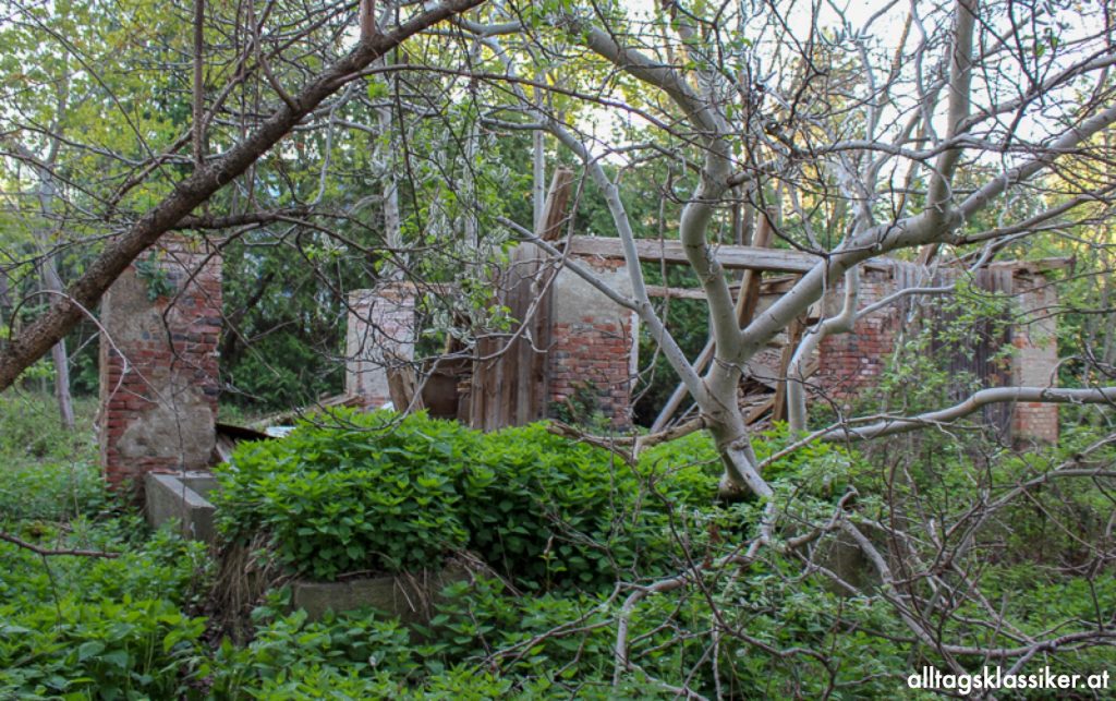 Das erste was man sieht, macht traurig: Ein halb eingestürztes Wirtschaftsgebäude von dem nur mehr die Grundmauern stehen, mittendrinnen zwei in Mitleidenschaft gezogene Fahrzeuge. Drumherum jede Menge Schutt, abgestürzte Dachziegel, das Gebälk des ehemaligen Dachstuhles und leere Bierdosen. Die Autos laufen mir nicht weg, dazu fehlen ihnen die Reifen und so manch anderes was sie am wegfahren hindert.