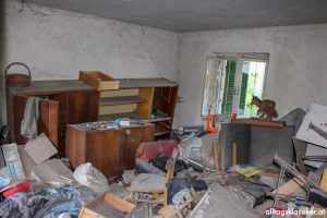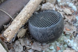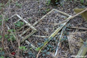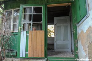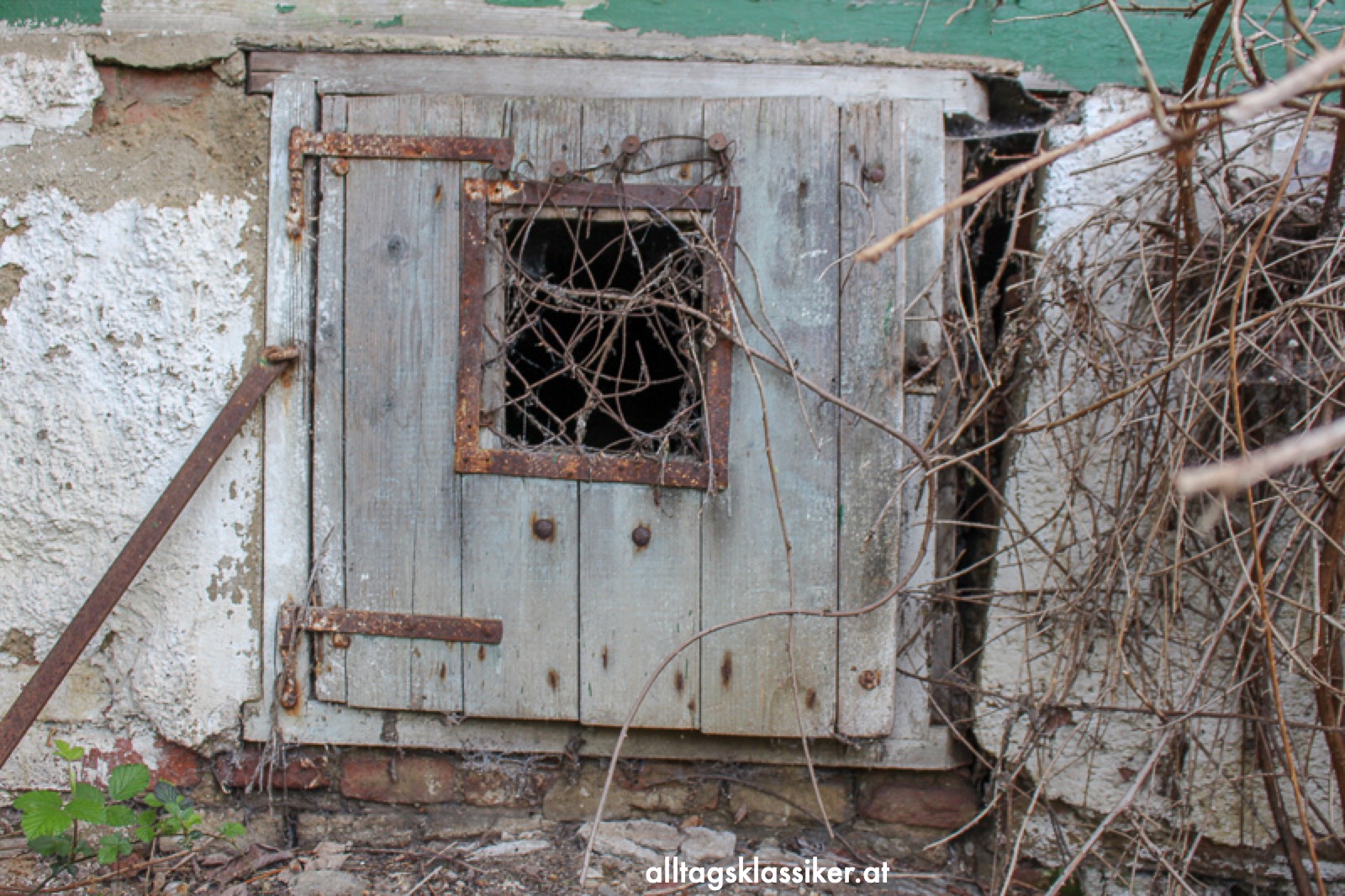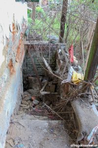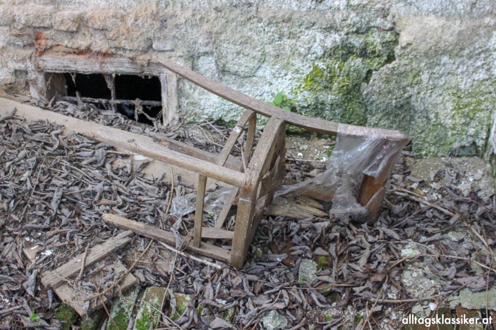Also erst mal das stark verwilderte Areal erkunden. Irgendwo zwischen Gestrüpp, schief gewachsenen Bäumen und frischen saftigen Brennnesseln in Wadenhöhe, steht das ehemalige Bauernhaus. Die Haustüre steht weit offen, Müllberge türmen sich davor. Hier haben offenbar Obdachlose gehaust, Kids gefeiert und den kläglichen Rest vom Haus dermassen zugemüllt das man deutlich erhöht durch die Räume gehen kann. Alles was noch brauchbar war und nicht niet- und nagelfest war, ist wohl schon gestohlen und davongetragen worden. Teilweise fällt das Haus bereits zusammen, zu mindestens einige Bretter des Bodens vom Dachboden hängen bedrohlich herab. Nichts wie raus hier und nur nicht an den unzähligen Glasscherben schneiden. Ein weiteres Wirtschaftsgebäude mit stallähnlichen Boxen ist westlich vom Haus, ebenfalls vollgestopft mit Müll.