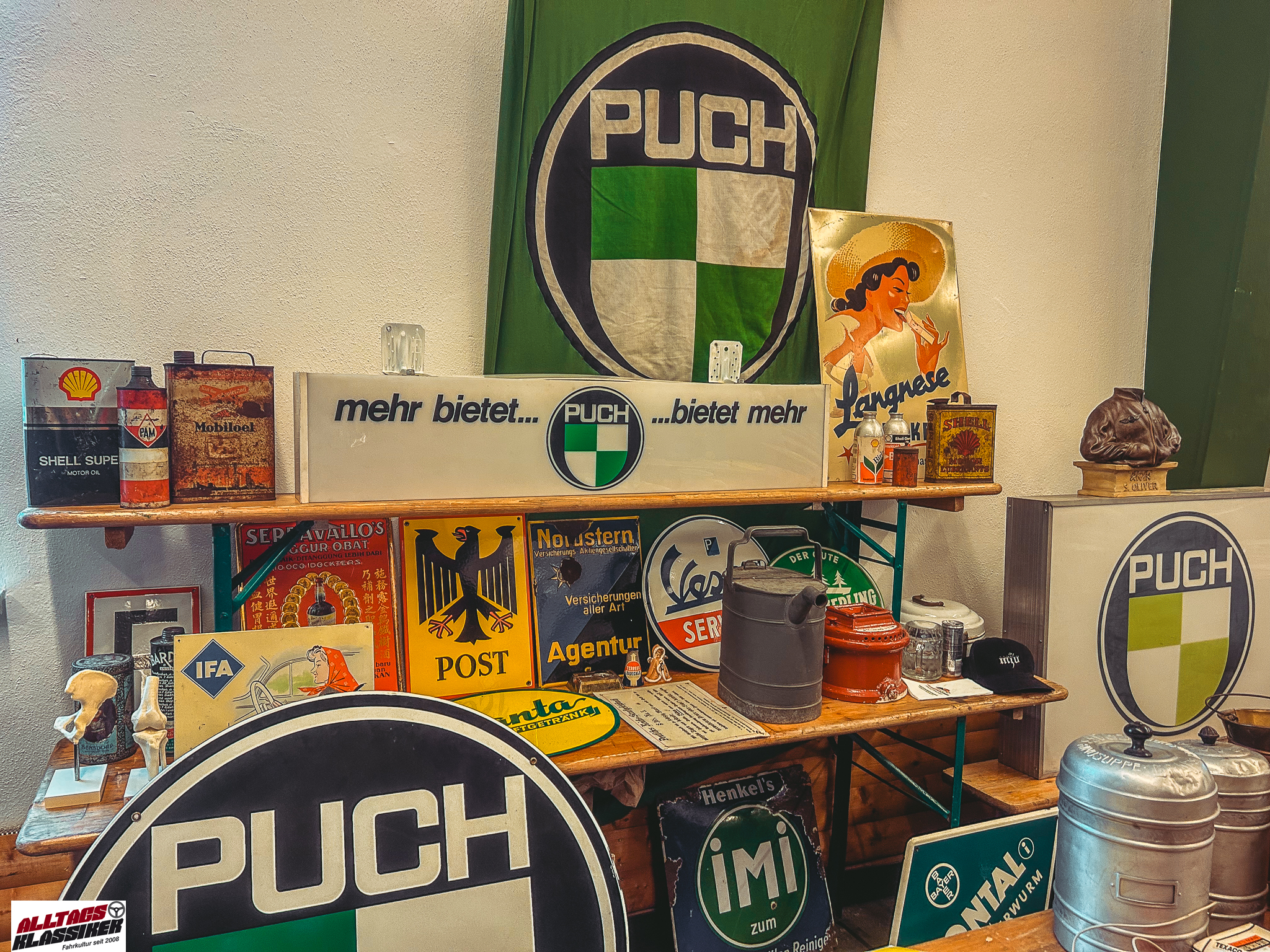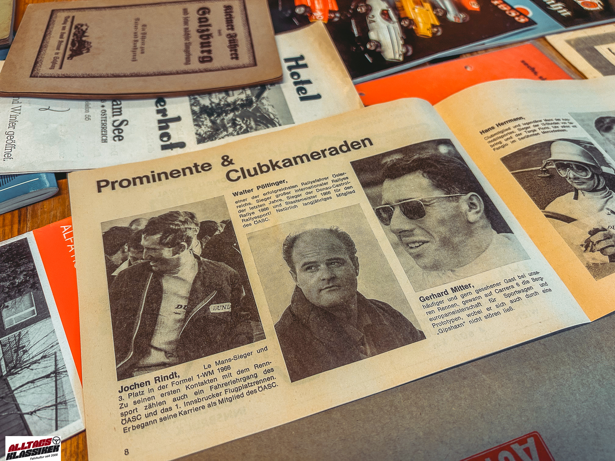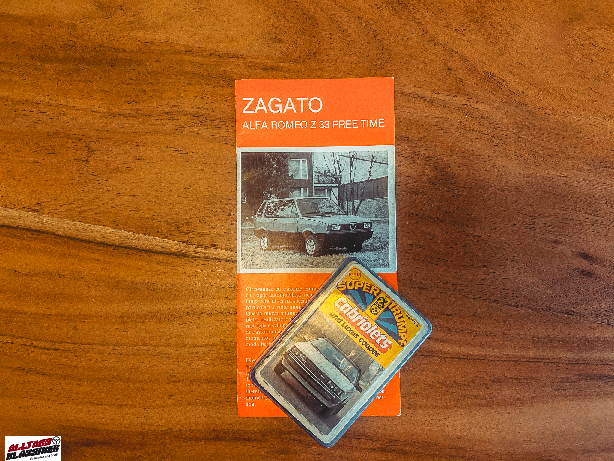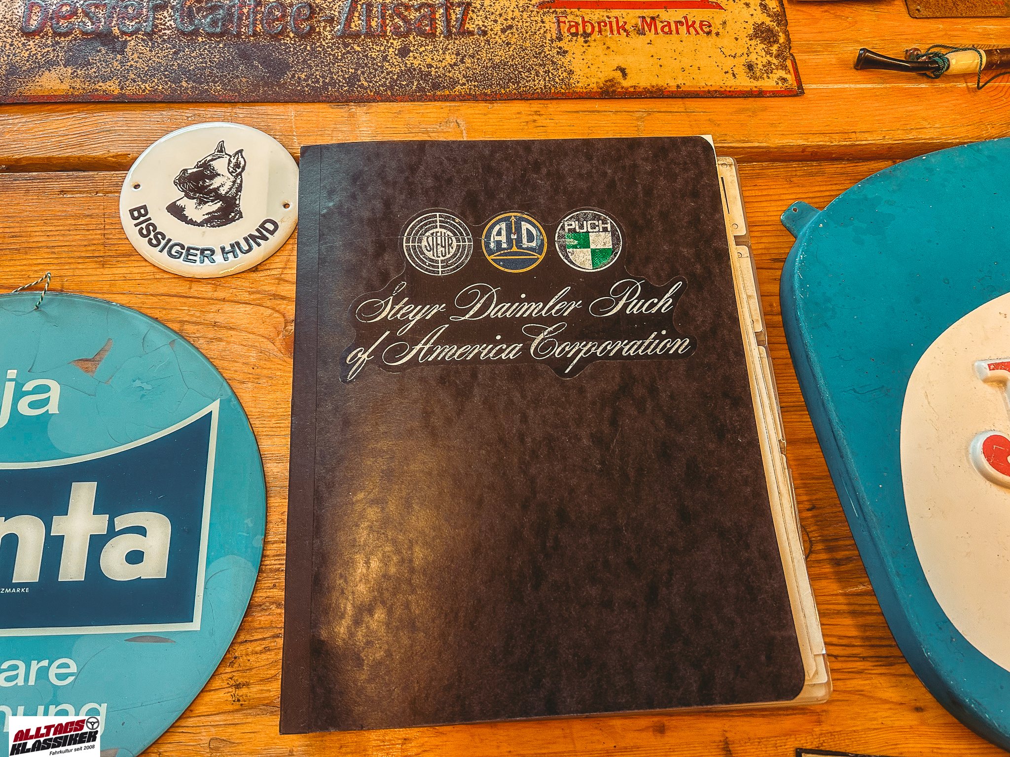 So entdeckten wir eine Mappe der Steyr-Daimler-Puch of America, die mittels umfangreicher Dokumentation und hunderter Dias den Auf- und Zusammenbau der nach Amerika importierten Puch Maxis erklärte. Ebenso die grüne Fahne, die einst den Vorplatz des Grazer Puchwerkes zierte. Ich wurde bei Valentin Eggbauer (Rent a Bulli) fündig, der mir einen Folder der Zagato-Studie des Alfa Romeo Z 33 Free Time schenkte. Zu diesem Fahrzeug wird es wohl zeitnah einen eigenen Beitrag geben.