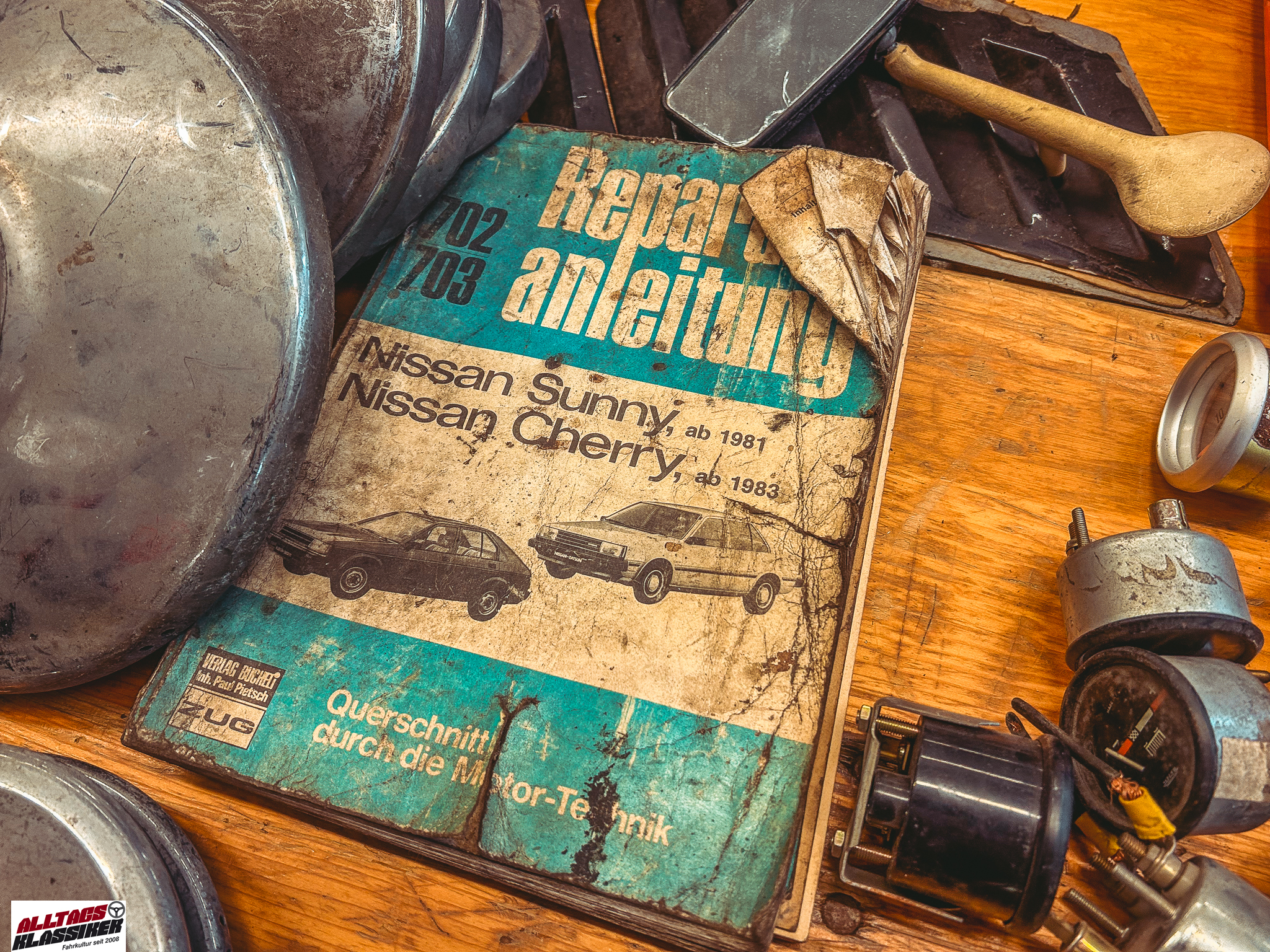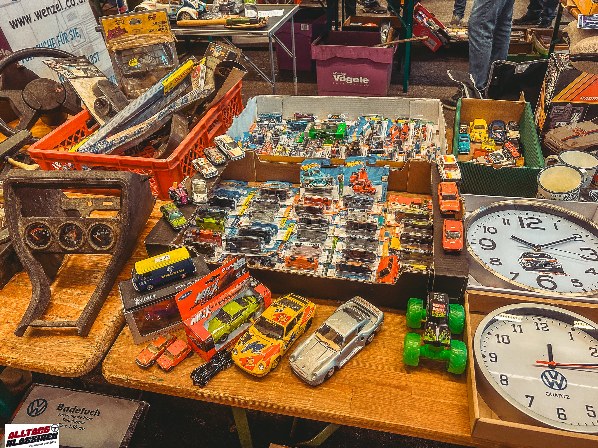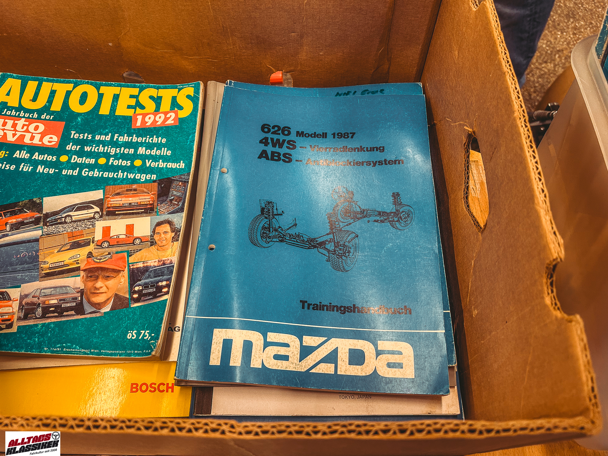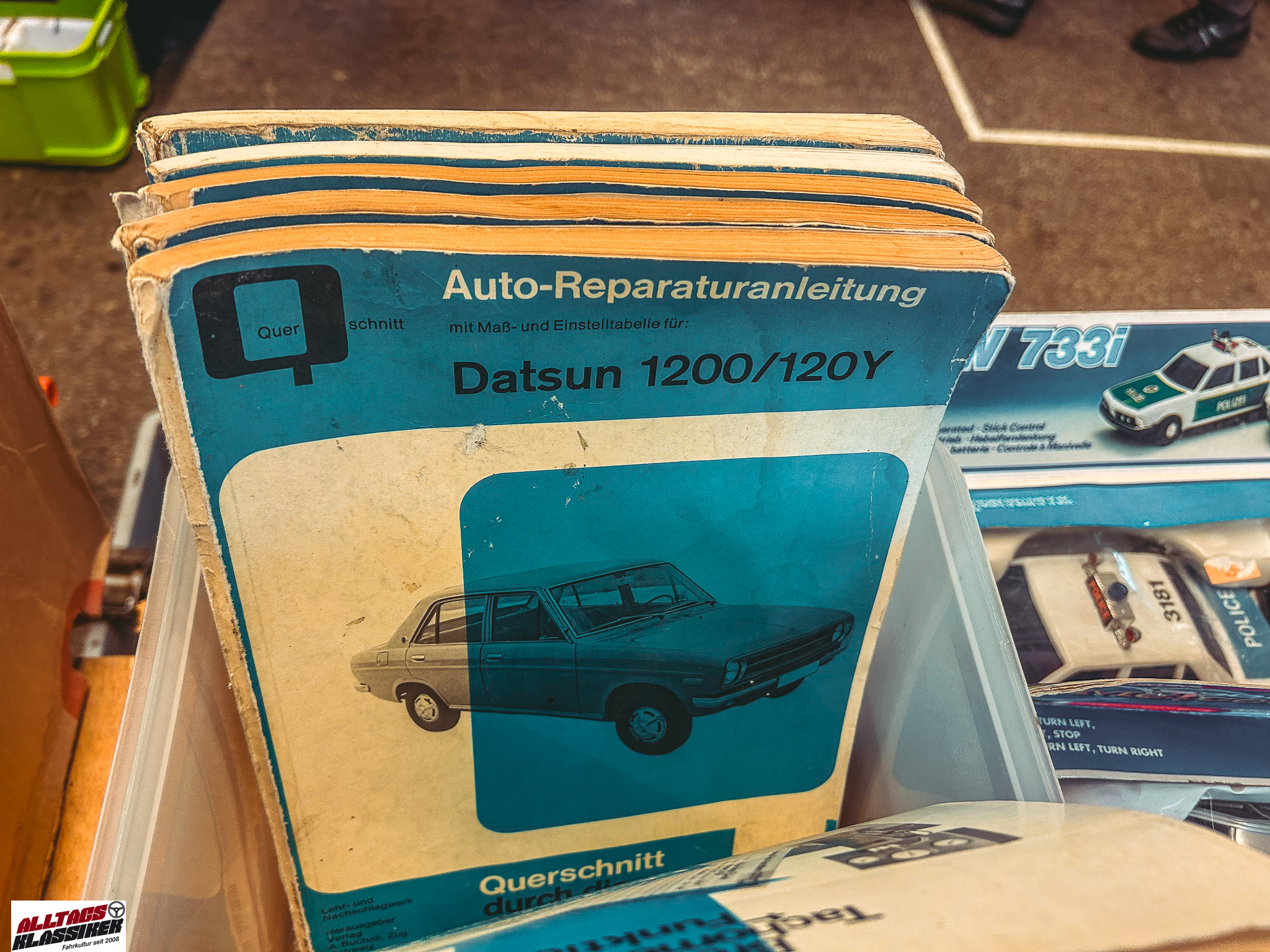 Neben Zuckerwattestand und einem mit Replika-Blechschildern gab es einige Stände, deren Teile man gefühlt jedes Jahr wieder und wieder sieht. Aber auch einige neue Standler mit feinster Automobilia konnte man in Oberdorf antreffen. Neben Hobby-Heften aus den frühen 70ern, Reparaturanleitungen für den Datsun 1200 und Nissan Cherry/Sunny, Einser-Post-Golf Rückleuchten ohne Rückfahrscheinwerfer, einer Betriebsanleitung eines Alfa Arna auf italienisch, einem Trainingshandbuch für den Mazda 626 GD mit 4WS-Vierradlenkung, sah man auch das eine oder andere schlüpfrige Magazin aus früheren Tagen. Aber auch neuwertige BMW- und Mercedes-Spielzeugautos in Originalverpackung mit Kabelfernbedienung, Lenkrädern, Achsschenkeln, Stoßdämpfern, Stoßstangen, Stahlfelgen und Drehzahlmessern suchten nach einem neuen Zuhause.