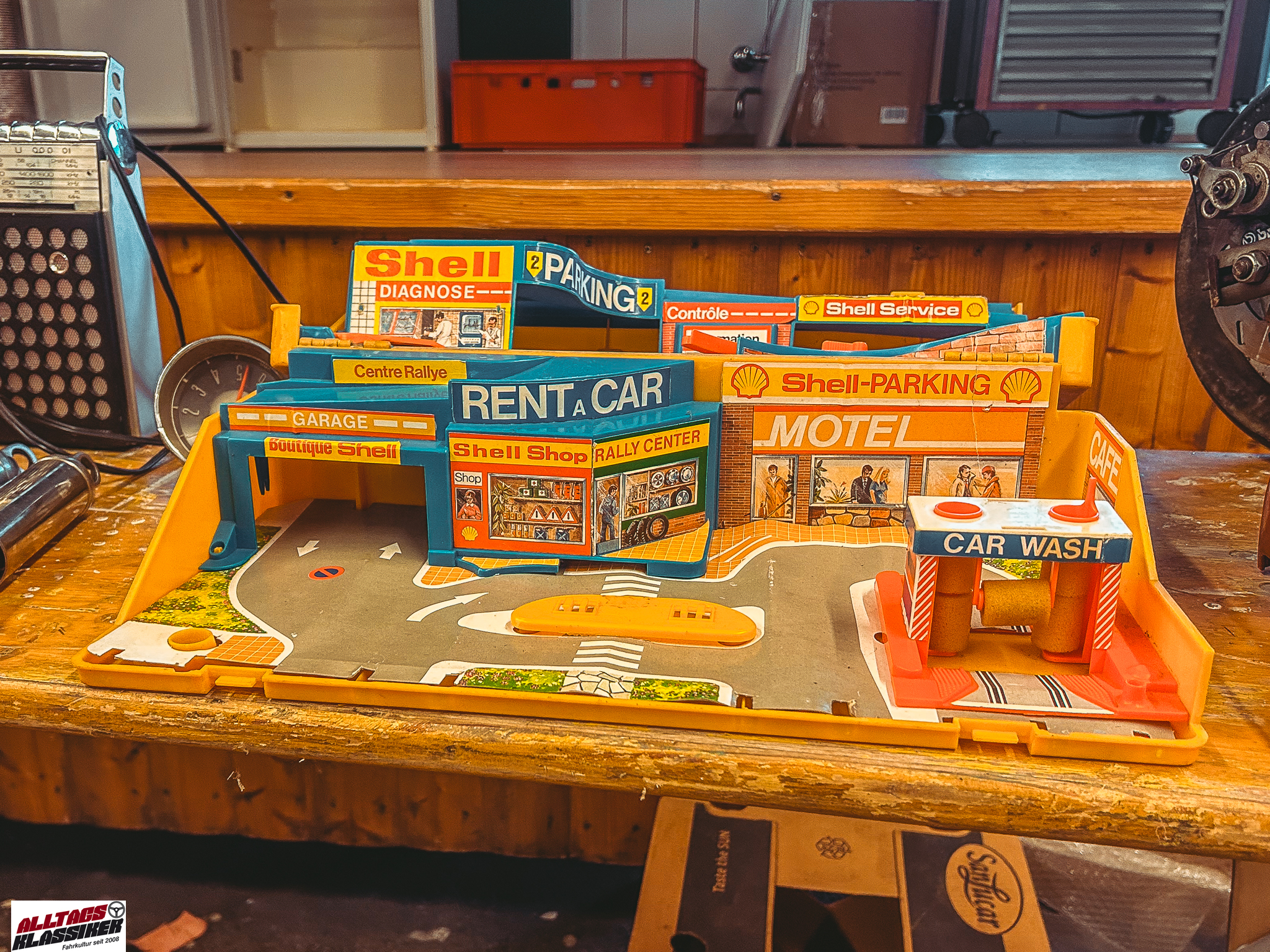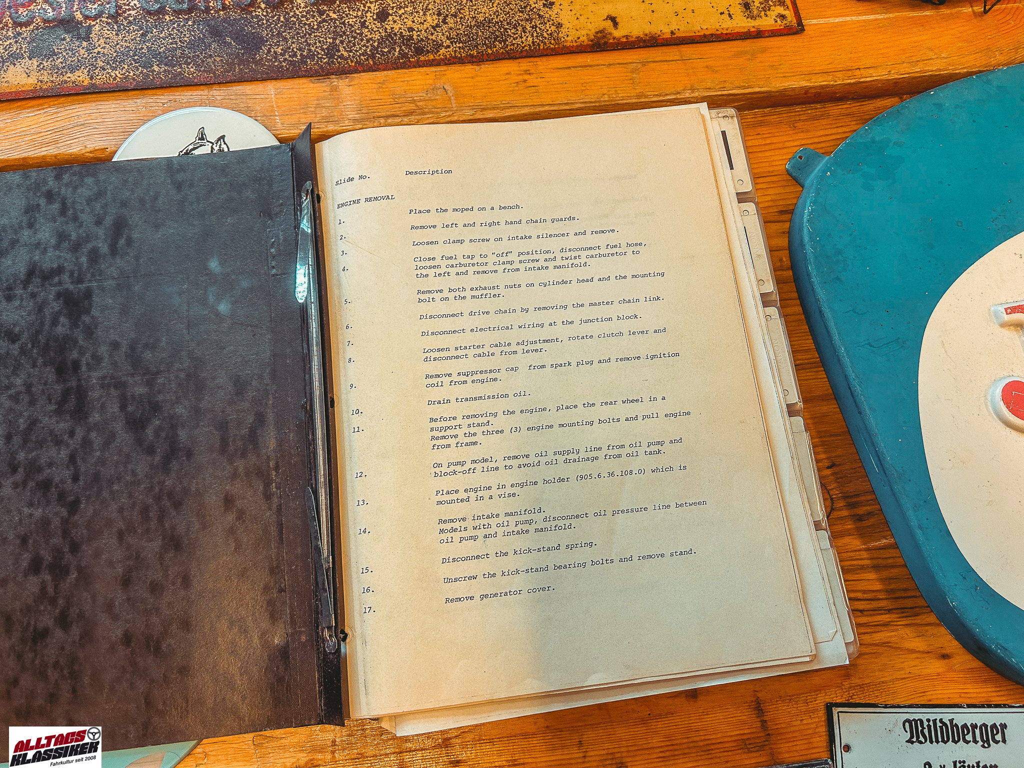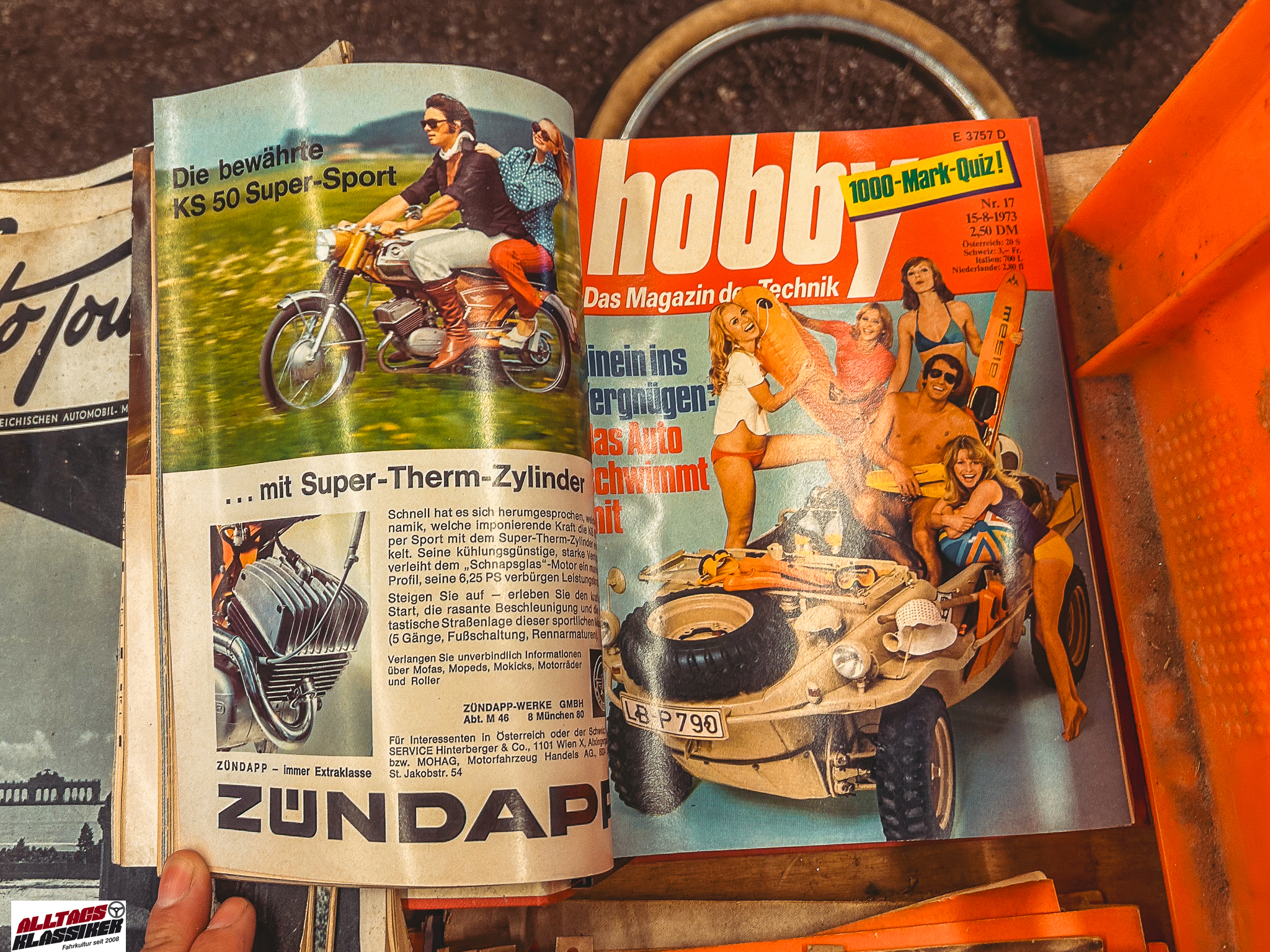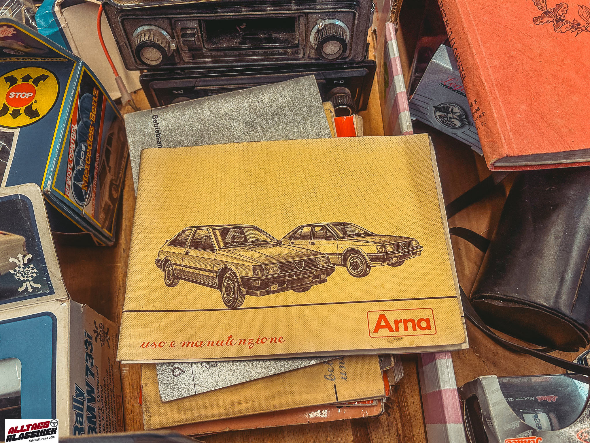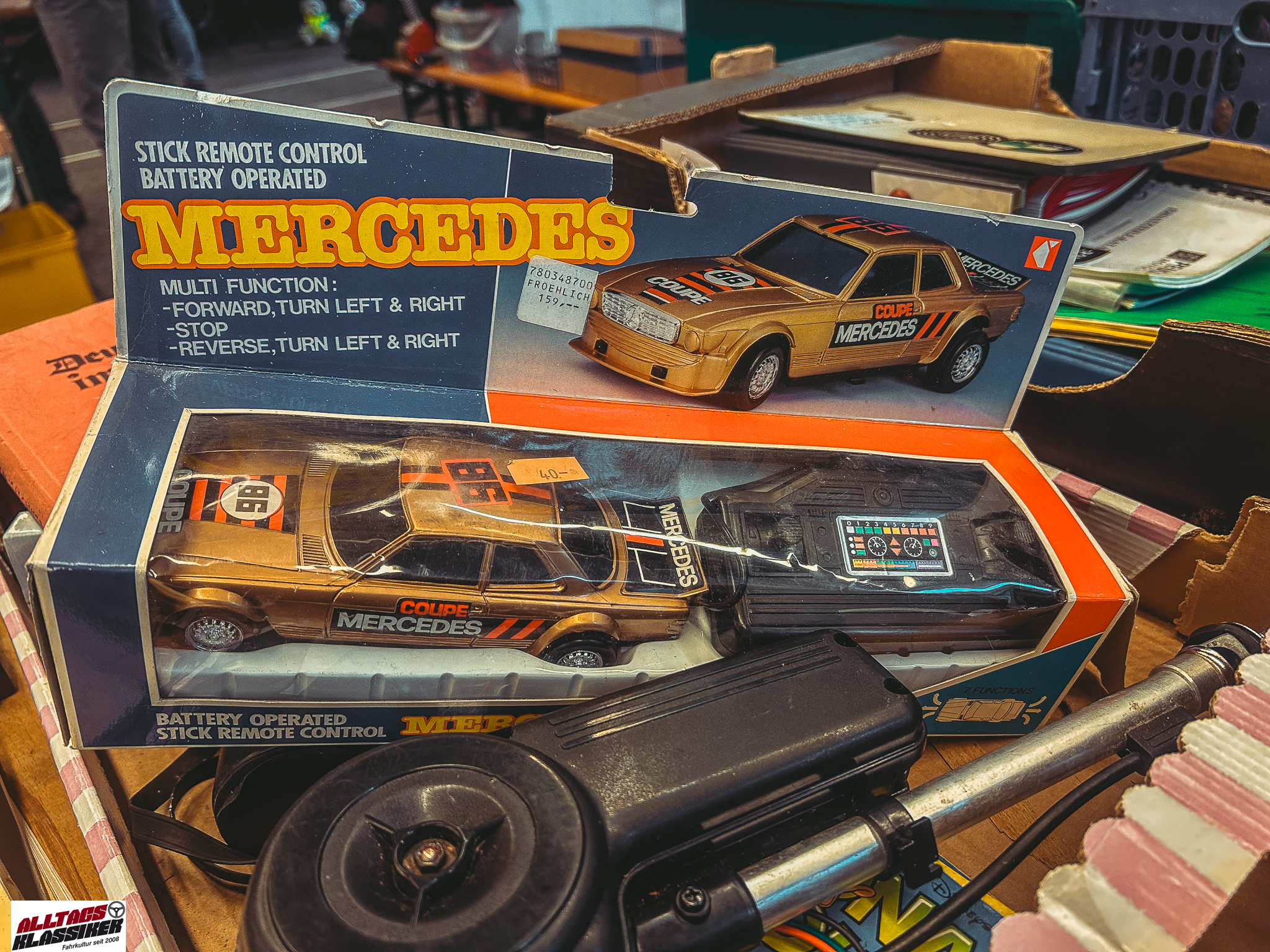 Neben Zuckerwattestand und einem mit Replika-Blechschildern gab es einige Stände, deren Teile man gefühlt jedes Jahr wieder und wieder sieht. Aber auch einige neue Standler mit feinster Automobilia konnte man in Oberdorf antreffen. Neben Hobby-Heften aus den frühen 70ern, Reparaturanleitungen für den Datsun 1200 und Nissan Cherry/Sunny, Einser-Post-Golf Rückleuchten ohne Rückfahrscheinwerfer, einer Betriebsanleitung eines Alfa Arna auf italienisch, einem Trainingshandbuch für den Mazda 626 GD mit 4WS-Vierradlenkung, sah man auch das eine oder andere schlüpfrige Magazin aus früheren Tagen. Aber auch neuwertige BMW- und Mercedes-Spielzeugautos in Originalverpackung mit Kabelfernbedienung, Lenkrädern, Achsschenkeln, Stoßdämpfern, Stoßstangen, Stahlfelgen und Drehzahlmessern suchten nach einem neuen Zuhause.