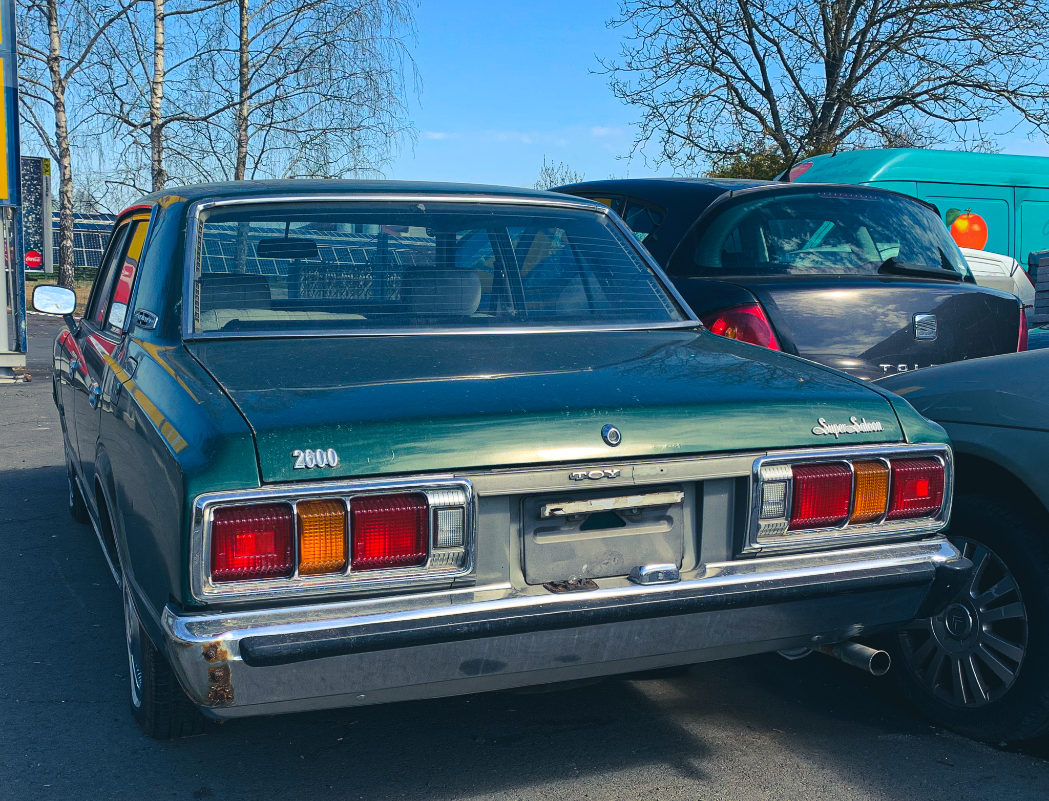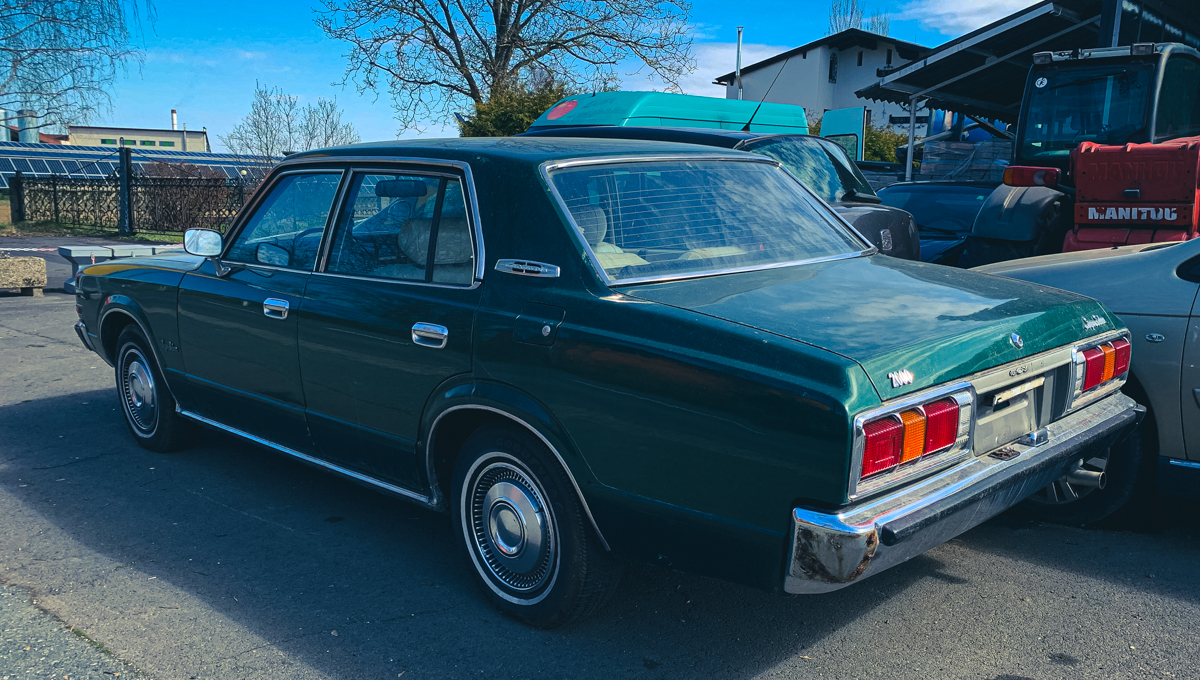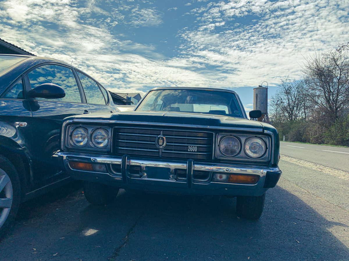 Am Ende dieser Ansammlung von Altblech ragt aber ein Fahrzeug heraus, das den Brems-jetzt-Reflex in mir auslöst. Der erste Gedanke ist ein Barock-Amerikaner der späten 70er. Viel Chrom, ansonsten jedoch recht strenge, klare Linien. Insgeheim hoffe ich natürlich auf einen Japaner jener Zeit, die diese Formensprache recht imitierten um am amerikanischen Markt zu reüssieren. So kommt es, dass ich meinen ersten Toyota Crown MS85 live sehe. Das Handy ist natürlich mit dabei und in wenigen Minuten umrunde ich den grünen Sensationsfund und mache ein paar Bilder. Viele feine Details machen den Toyota Crown 2600 Super Saloon aus dem Baujahr 1974 aus: Ein elegantes dunkelgrün-metallic außen, plüschig weiches braunes Interieur. Am Automatikgetriebe hängt ein seidenweicher Reihensechszylinder mit 140 PS Leistung und Antrieb an der Hinterachse. Das letzte gültige Pickerl am Fahrzeug weist auf das Ablaufdatum Juli 2001 hin.