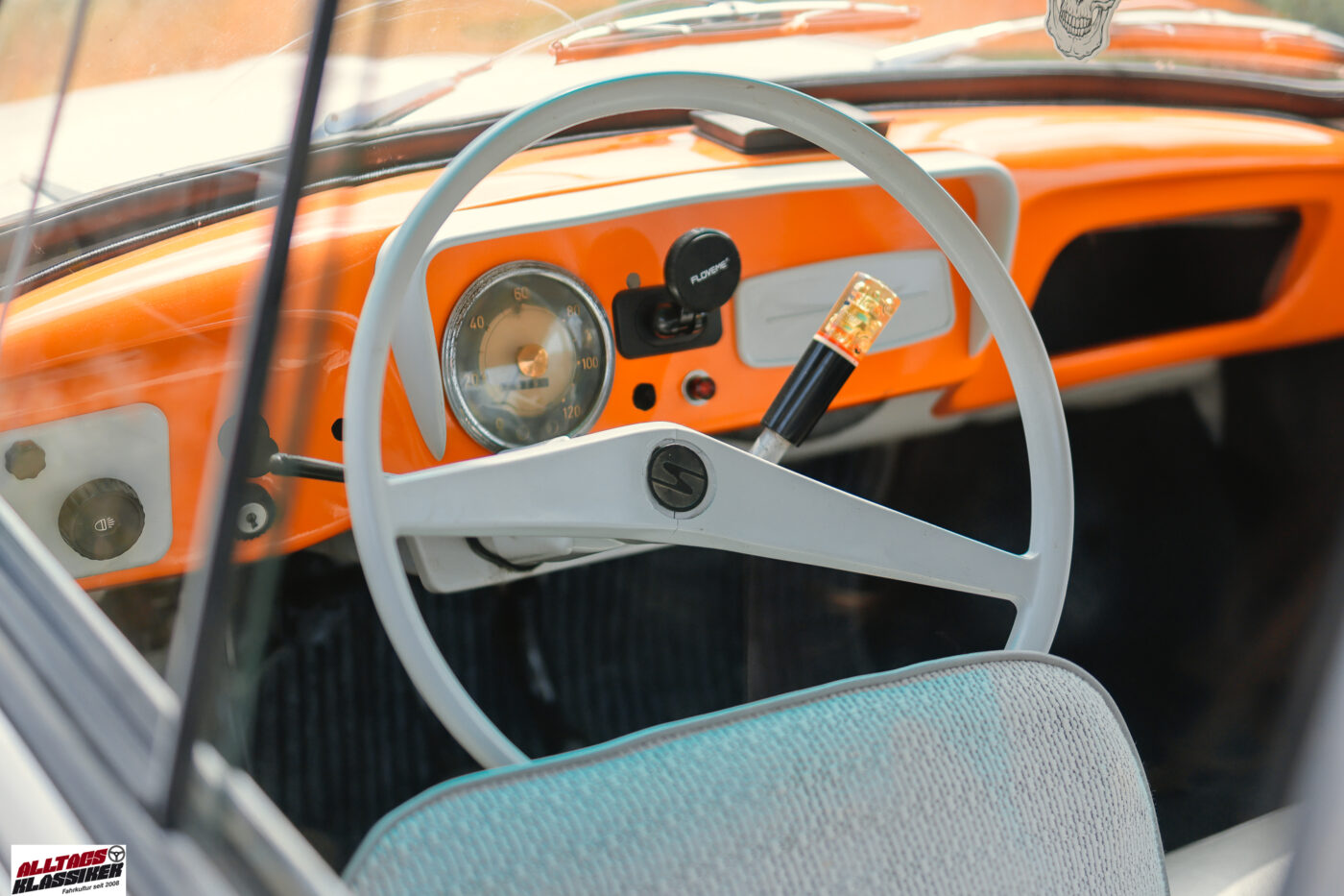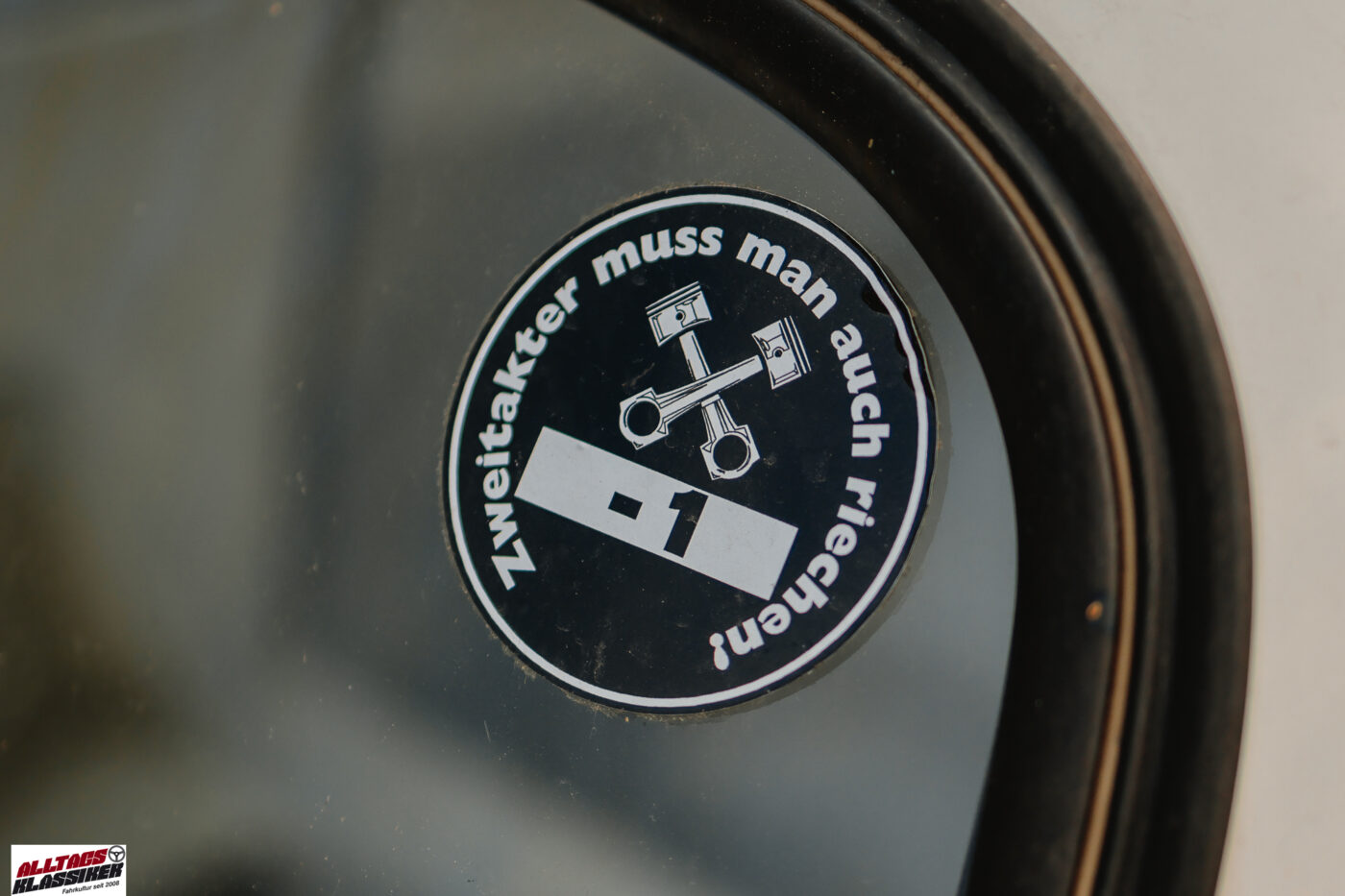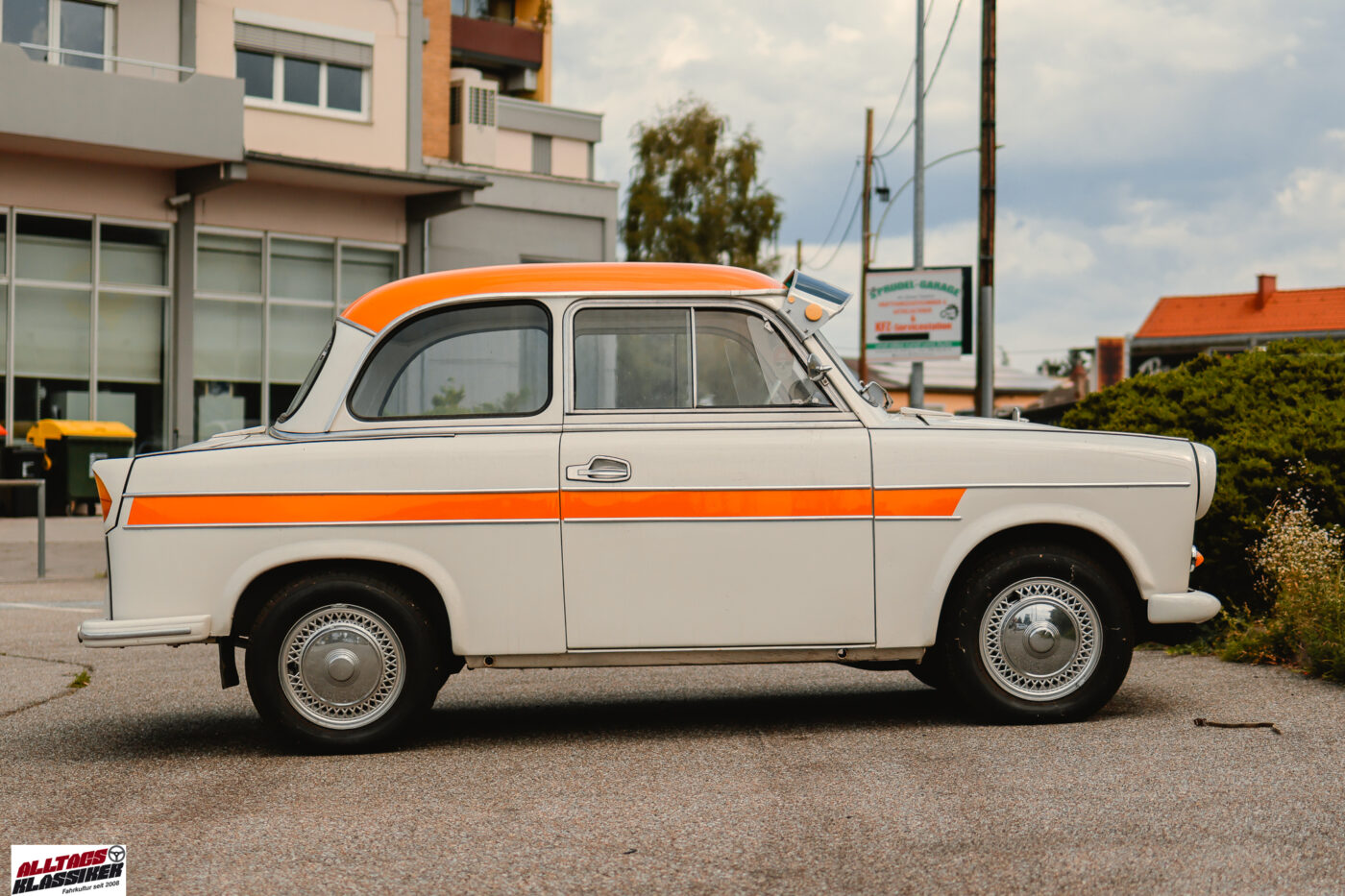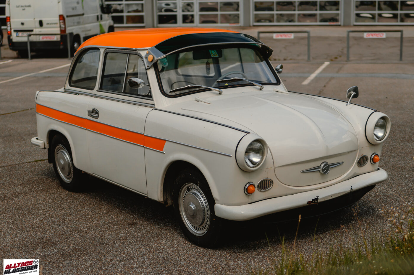 Manchmal hat man kurz vor daheim dann doch noch Fotoglück, und es findet sich noch ein Fahrzeug. Dieses Mal lachte uns am Parkplatz, den sich ein Reifenhändler und eine Kfz-Werkstatt teilen, ein Kleinwagen mit kräftigen Farbakzenten an. Mein erster Gedanke: Ein Trabant P50! Ewig keinen mehr gesehen. Der letzte P50, der uns unterkam, war ein türkiser, der uns bei der längst verblichenen, heißgeliebten 200 Minuten Classic auf einigen Sonderprüfungen vor der Nase herumfuhr. Ja, vor der Nase – denn so ein angestrengt sich einen Hügel hochkämpfender Zweitakter mit sanfter Motorleistung ist olfaktorisch wahrlich kein Genuss! Da freut man sich, wenn man den kleinen Stinker hinter sich lässt und wieder frische steirische Luft atmen kann.